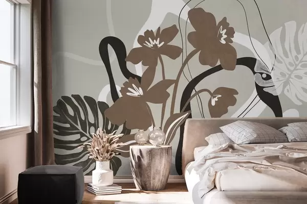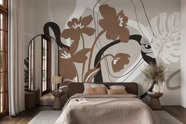 Papier peint photo Fleurs brunes abstraites texturées avec des formes blanches et noires sur fond beige, art minimaliste N° w09645v1