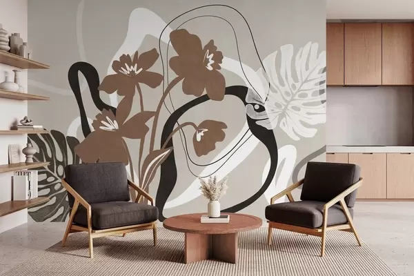 Papier peint photo Fleurs brunes abstraites texturées avec des formes blanches et noires sur fond beige, art minimaliste N° w09645v1