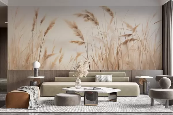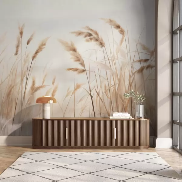 Papier peint photo Hautes herbes sèches et texturées avec des épis de blé dans le champ sur un fond doux et pâle N° w09648