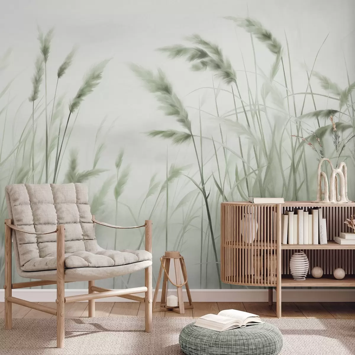 Papier peint photo Hautes herbes sèches et texturées avec des épis de blé dans le champ sur un fond doux et pâle N° w09648v1