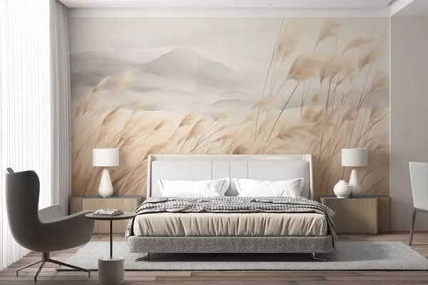 Papier peint photo Paysage montagneux texturé avec de hautes herbes sèches sous un ciel brumeux N° w09649