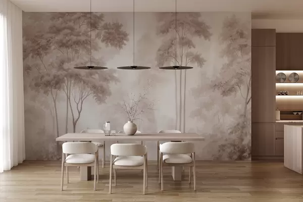 Papier peint photo Paysage forestier abstrait dans des tons beige fumé, créant une impression de profondeur N° w09657