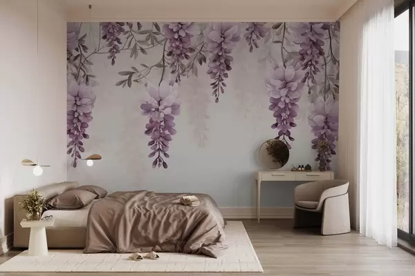 Papier peint photo Délicates et larges branches de lavande suspendues au mur, imitation aquarelle N° w09690