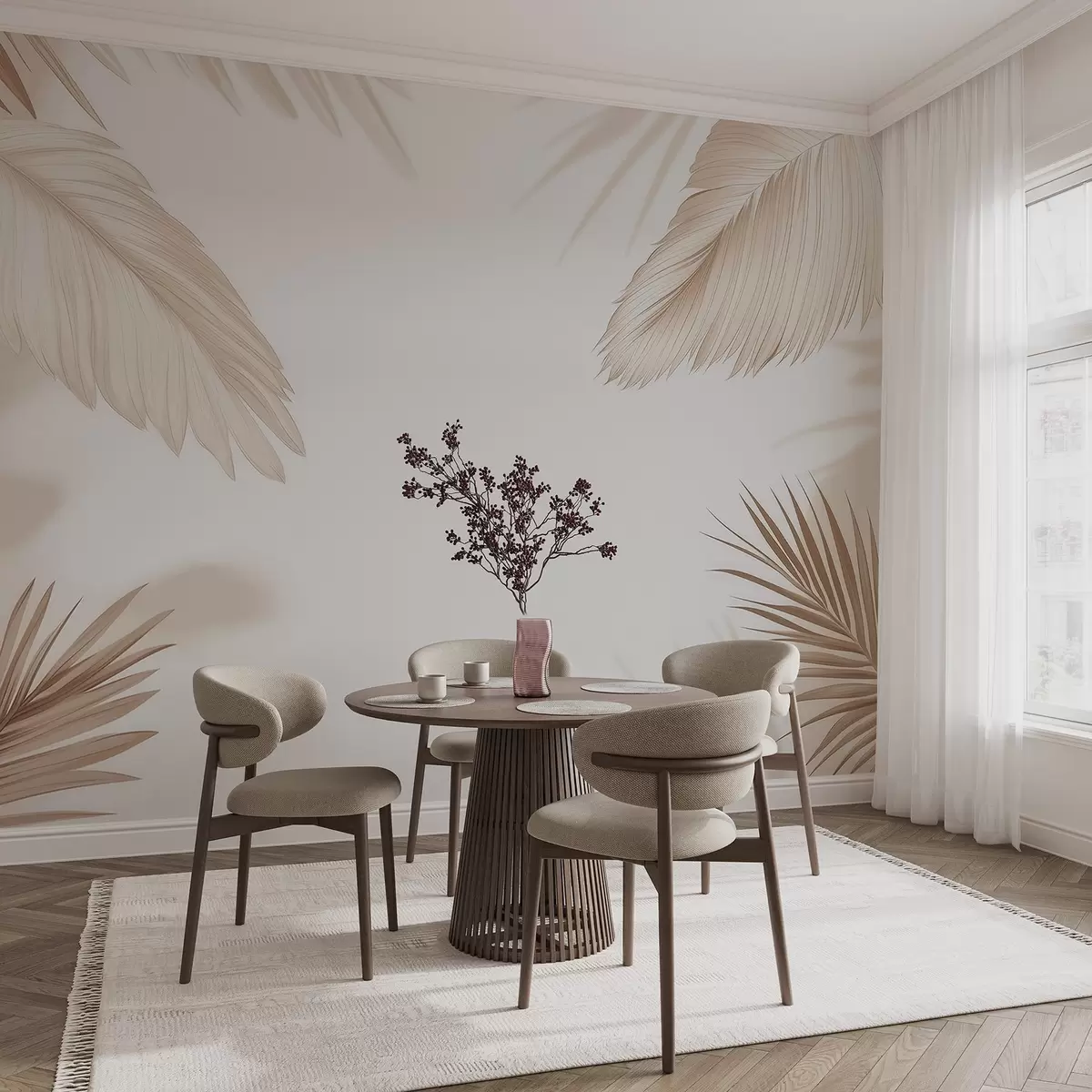 Papier peint photo Décor tropical dans les tons beiges, avec des silhouettes de feuilles de palmier et des ombres douces N° w09714