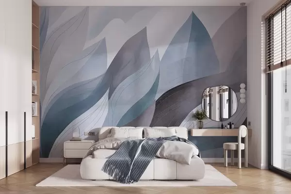 Papier peint photo Feuilles abstraites, tons terreux discrets de bleu avec des détails aux lignes délicates, texture douce de l'aquarelle. N° w09736v1