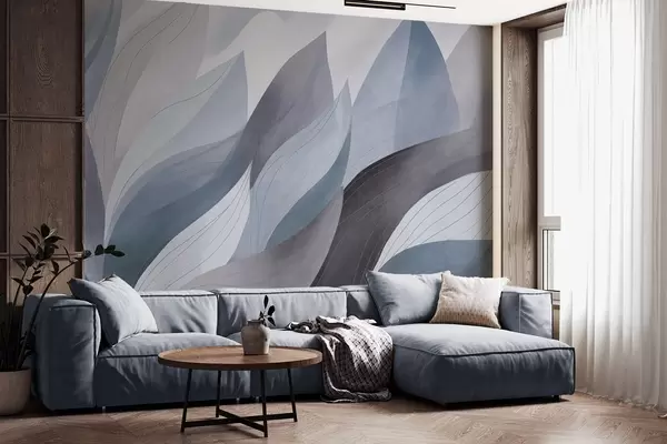 Papier peint photo Feuilles abstraites, tons terreux discrets de bleu avec des détails aux lignes délicates, texture douce de l'aquarelle. N° w09736v1
