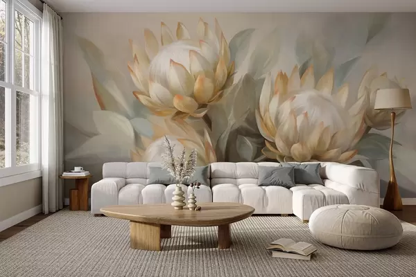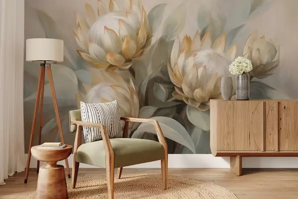 Papier peint photo Fleurs de protéa texturées avec des feuilles vertes et un arrière-plan doux et flou N° w09738
