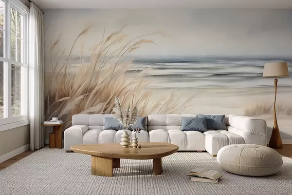 Papier peint photo Paysage texturé avec de l'herbe sèche sur une plage de sable, avec l'océan et le ciel en arrière-plan N° w09739