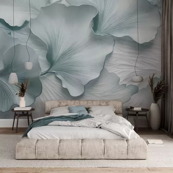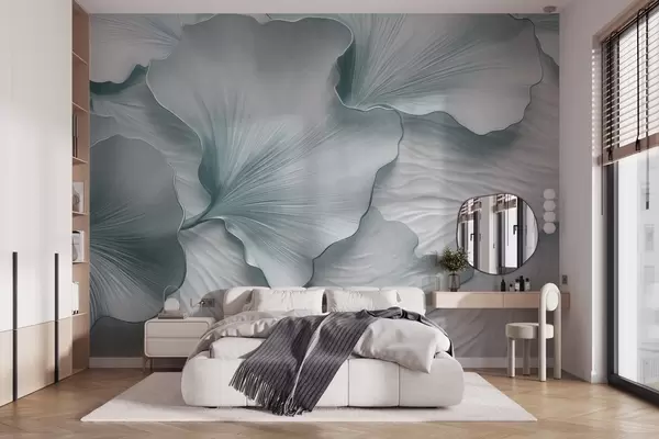 Papier peint photo Pétales de feuilles de ginkgo texturées, bleues et blanches, avec un imprimé organique délicat N° w09741v1