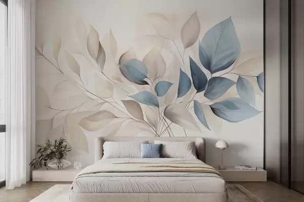 Papier peint photo Feuilles abstraites translucides dans des tons de bleu, beige et crème, art texturé N° w09744