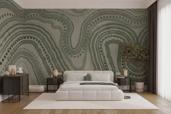 Papier peint photo Lignes ondulées et points abstraits verts et beiges, art moderne texturé N° w09747