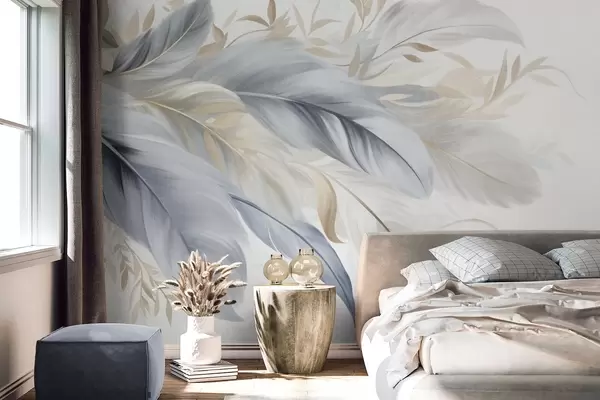 Papier peint photo Des plumes aux couleurs pastel texturées et des feuilles délicates sur un fond clair N° w09763