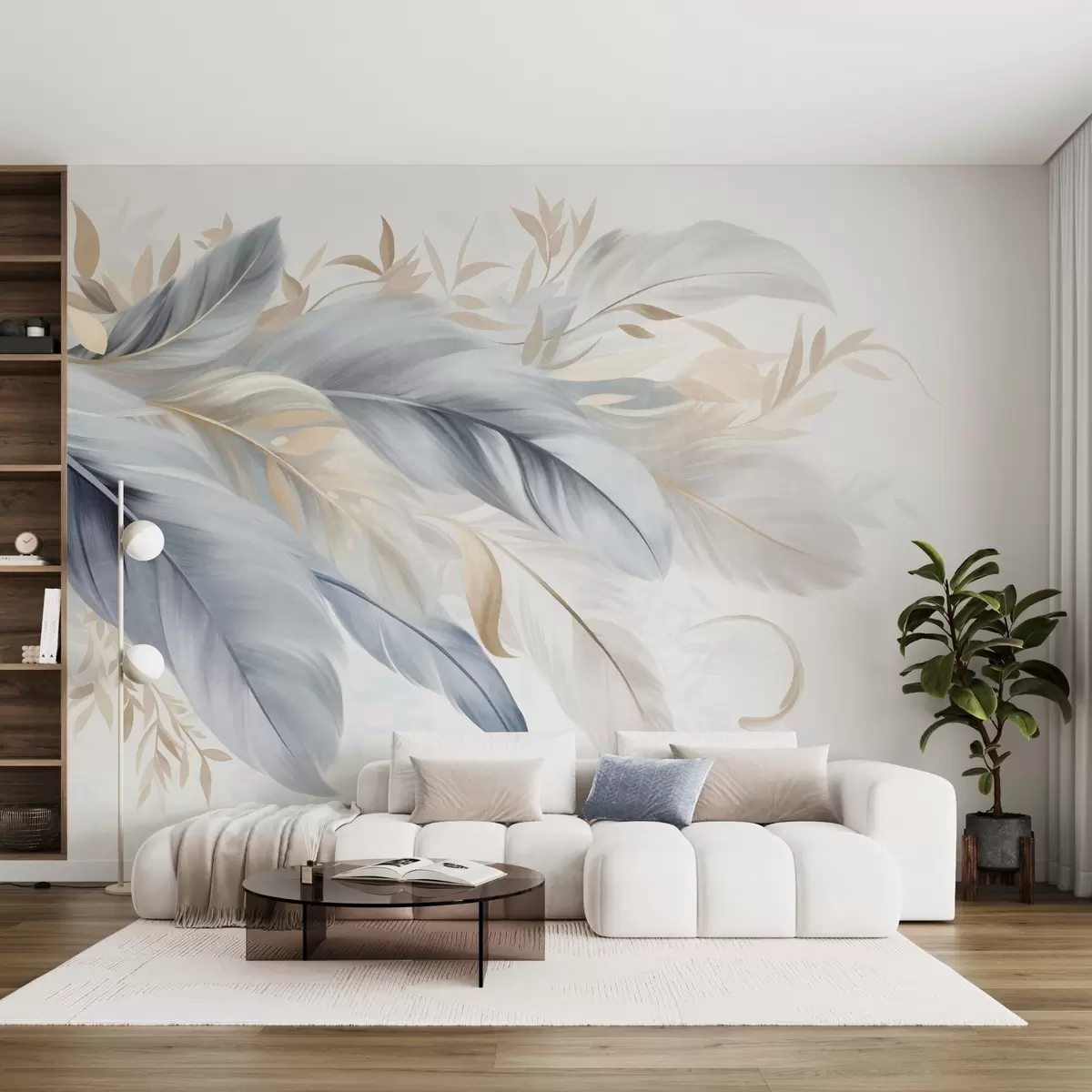 Papier peint photo Des plumes aux couleurs pastel texturées et des feuilles délicates sur un fond clair N° w09763
