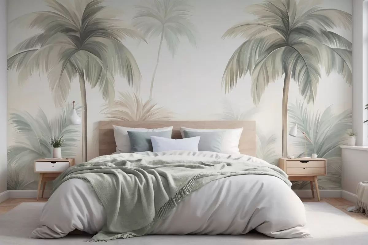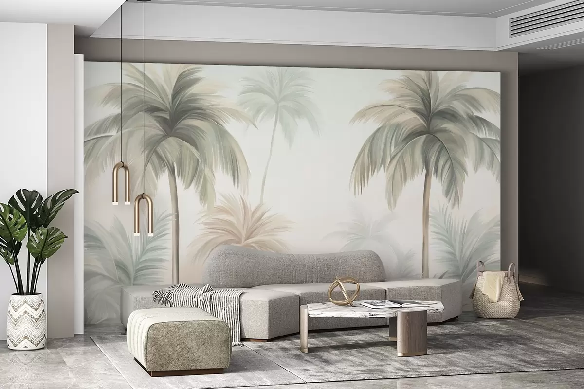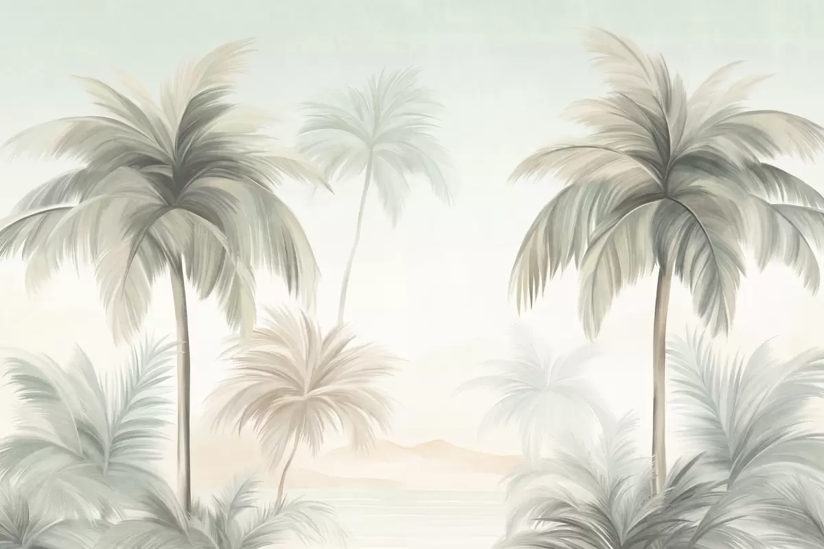 Papier peint photo Des palmiers aux feuilles texturées, d'un vert et d'un beige discrets, se détachant sur un ciel clair N° w09770