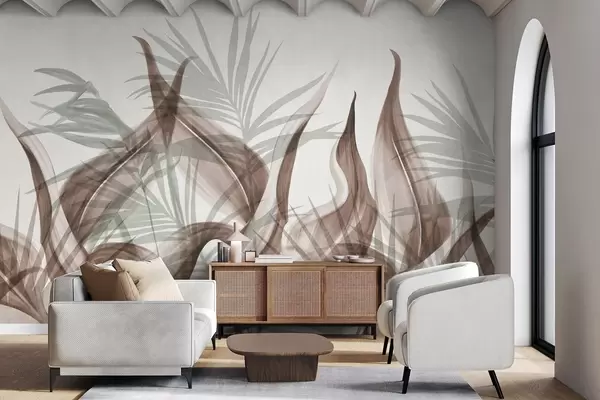 Papier peint photo Feuilles tropicales dans des tons de brun et de vert sur fond blanc, style aquarelle texturé N° w09772