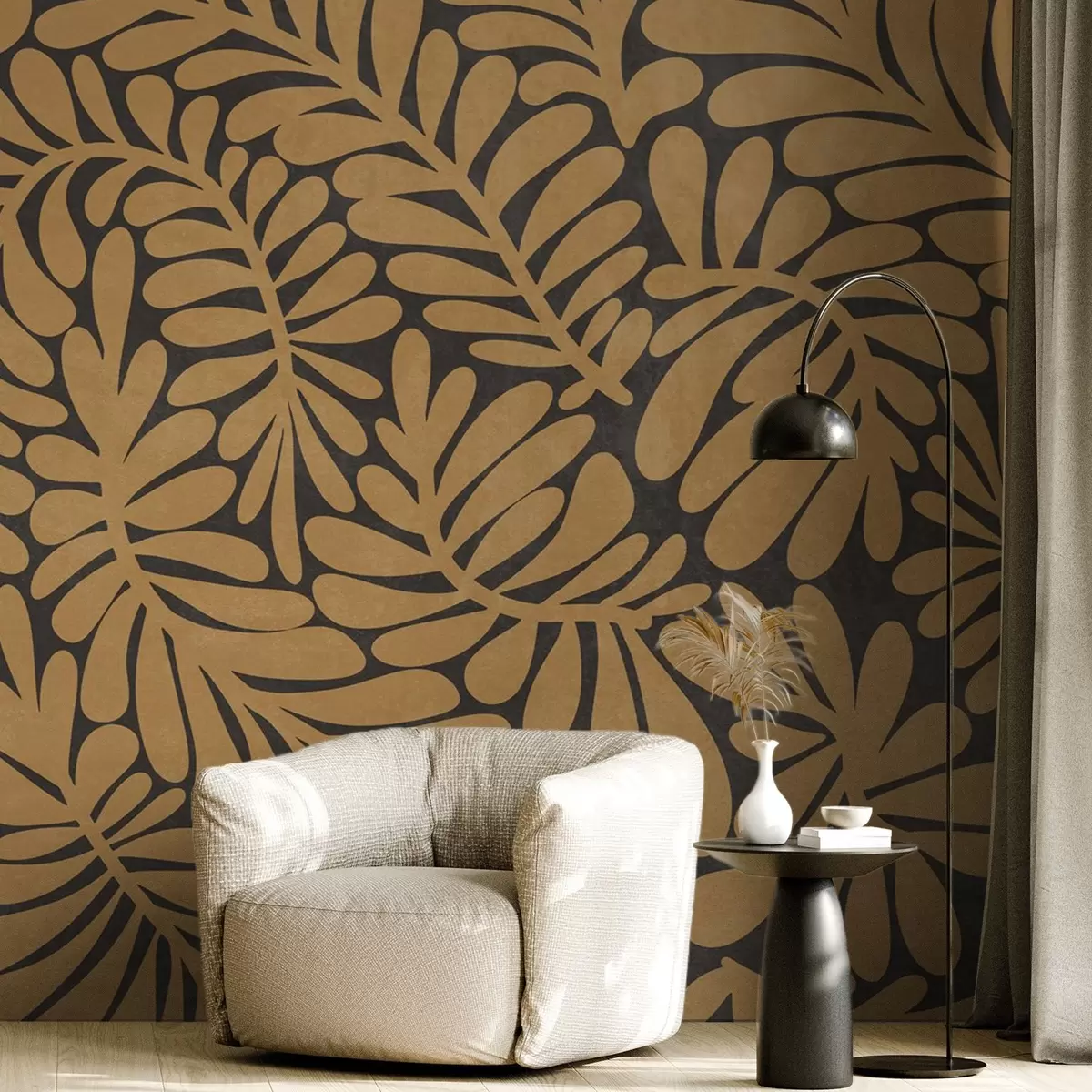 Papier peint photo Feuilles jaune moutarde stylisées sur fond gris foncé, illustration texturée N° w09775