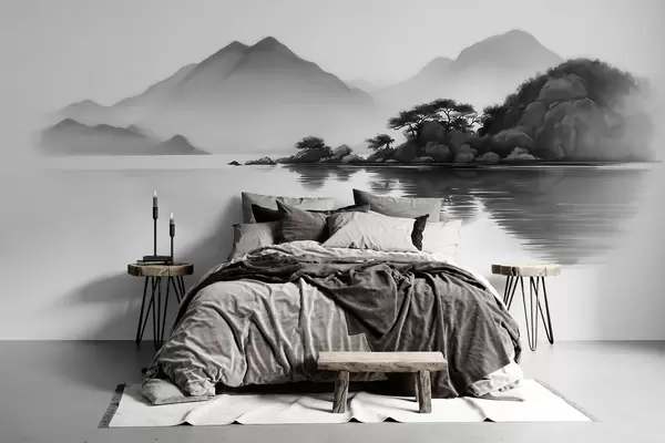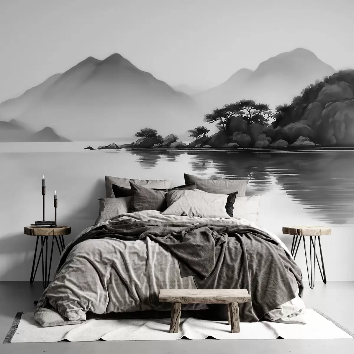 Papier peint photo Paysage en noir et blanc avec des montagnes et un lac dans une brume légère N° w09803