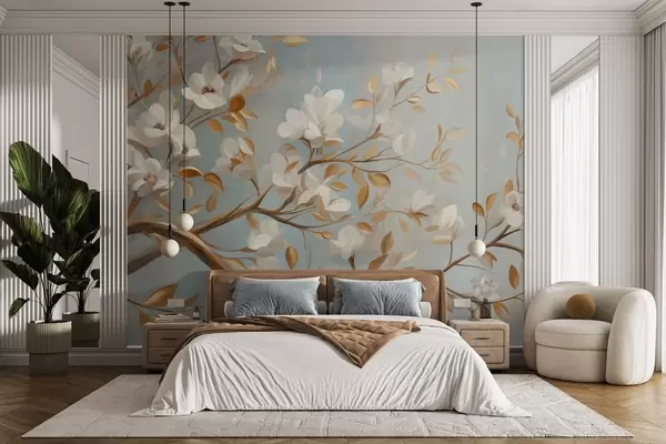 Papier peint photo Branche d'arbre texturée avec des fleurs blanches et des feuilles jaunes, style vintage N° w09814