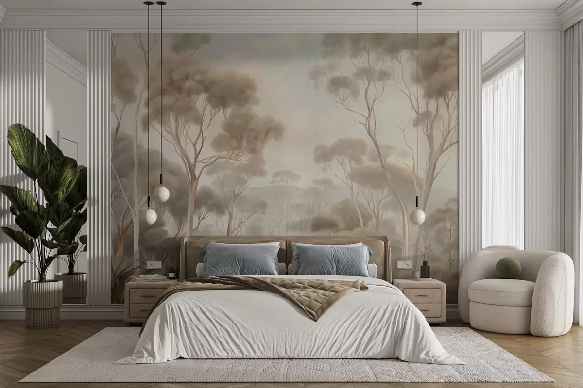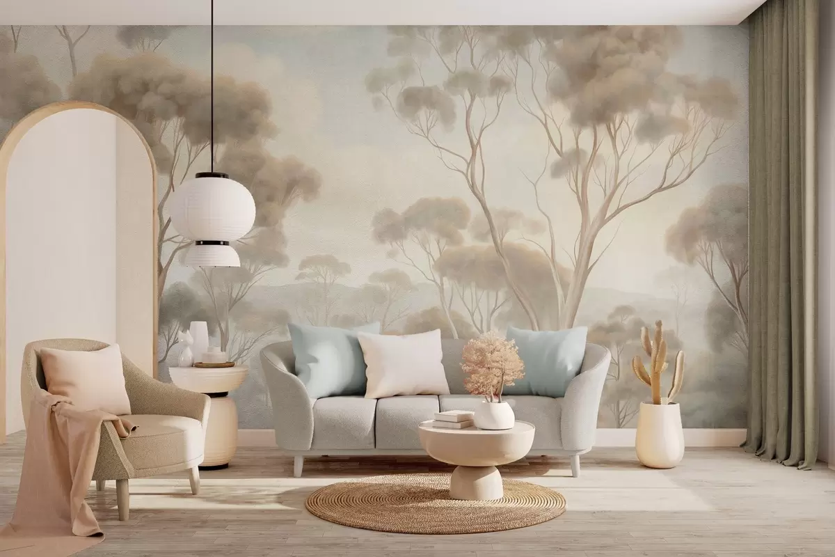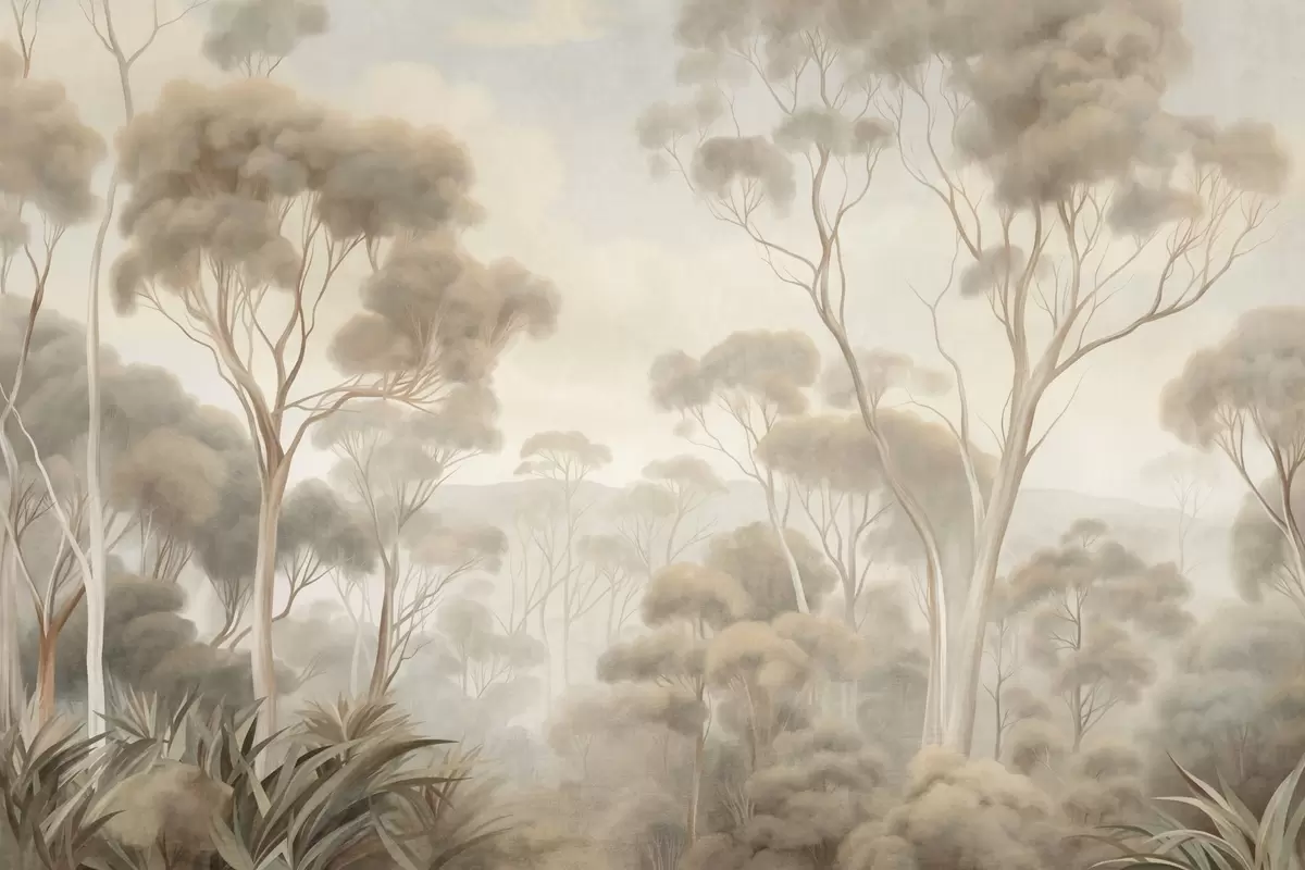 Papier peint photo Un paysage forestier brumeux avec de grands eucalyptus, des collines ondulantes sous un ciel nuageux, illustration texturée N° w09822