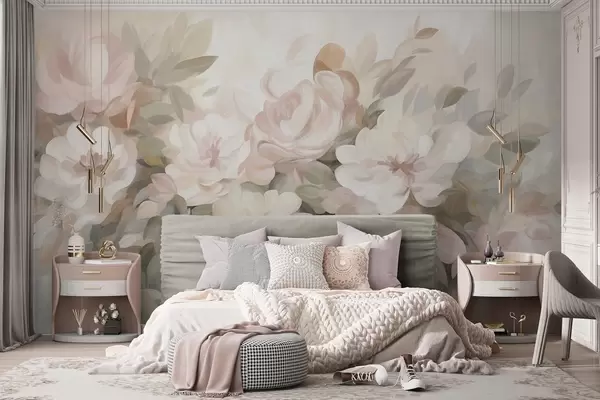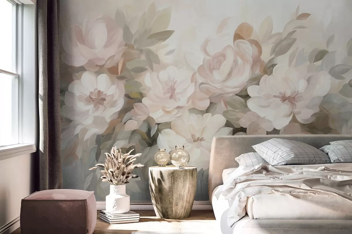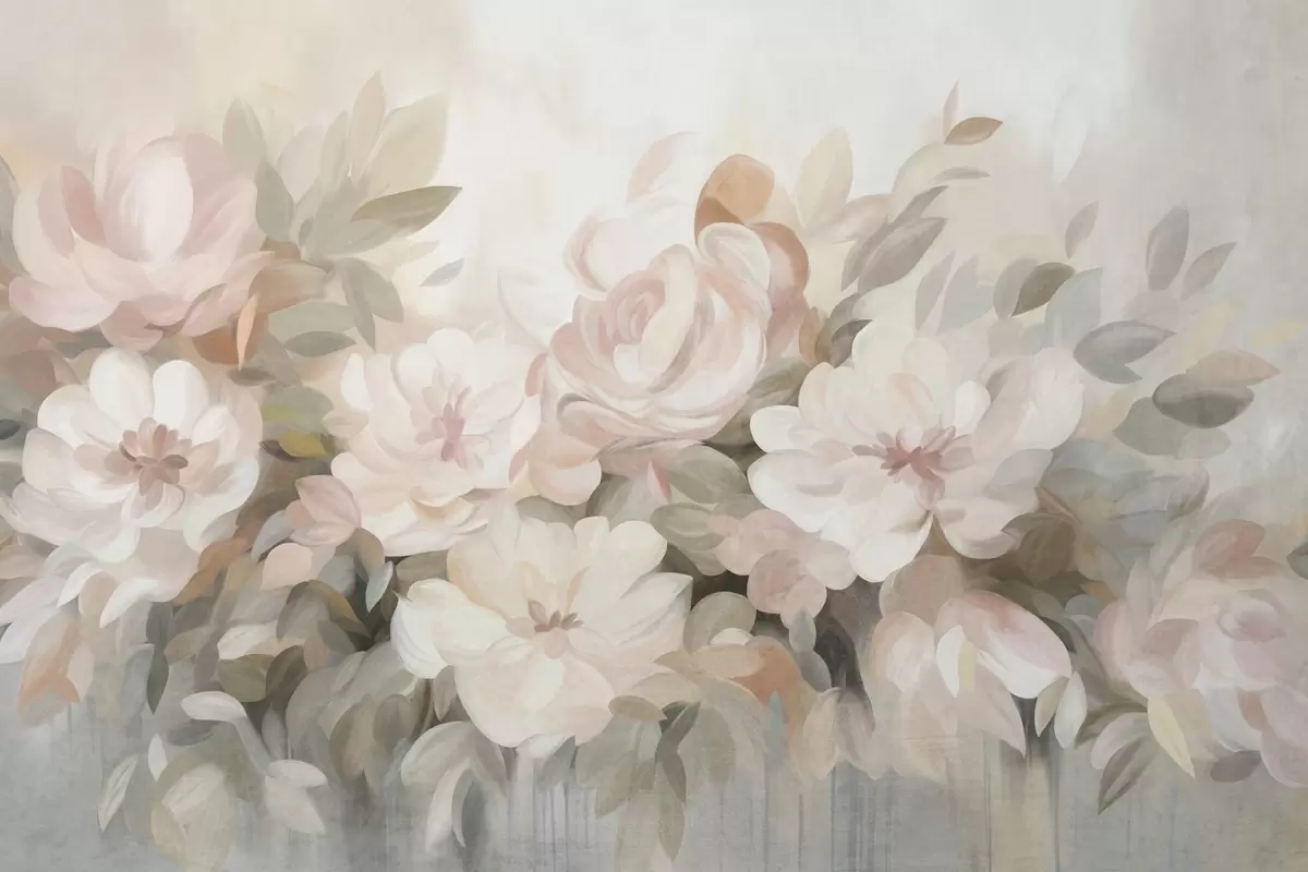 Papier peint photo Fleurs rose pâle et blanches avec des feuilles vertes, style peint, style impressionniste, art texturé N° w09824
