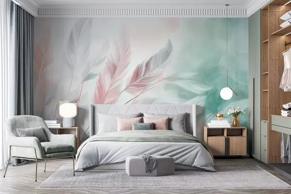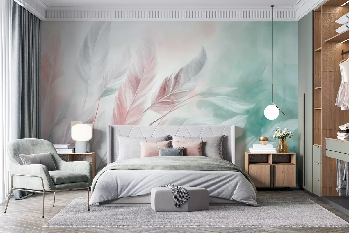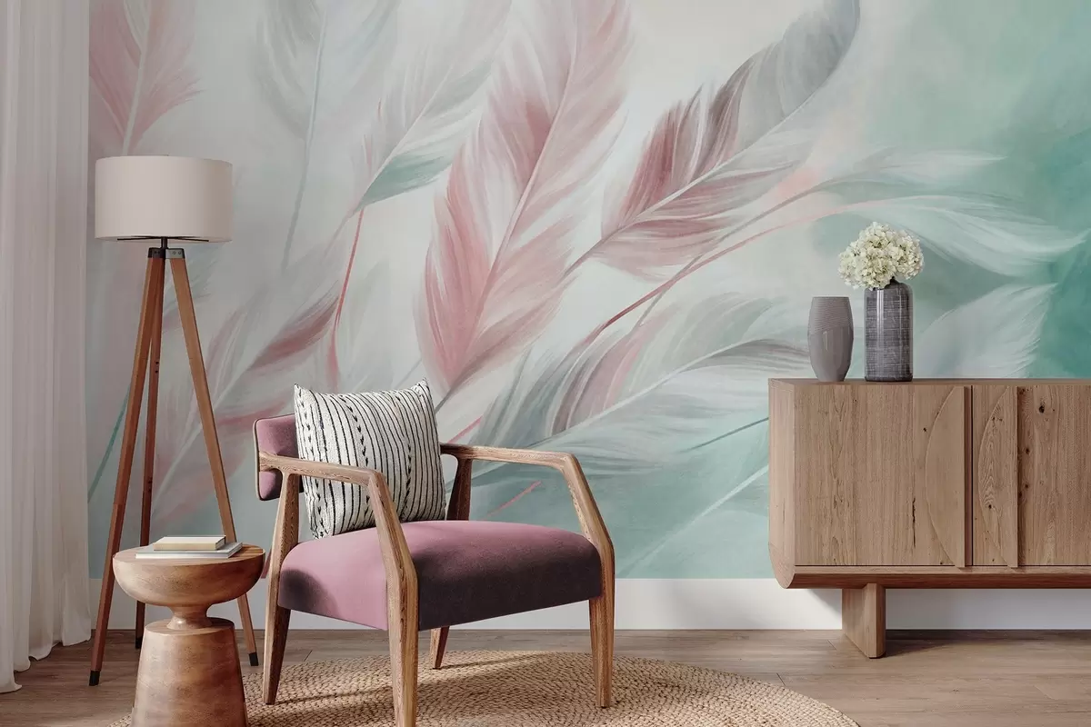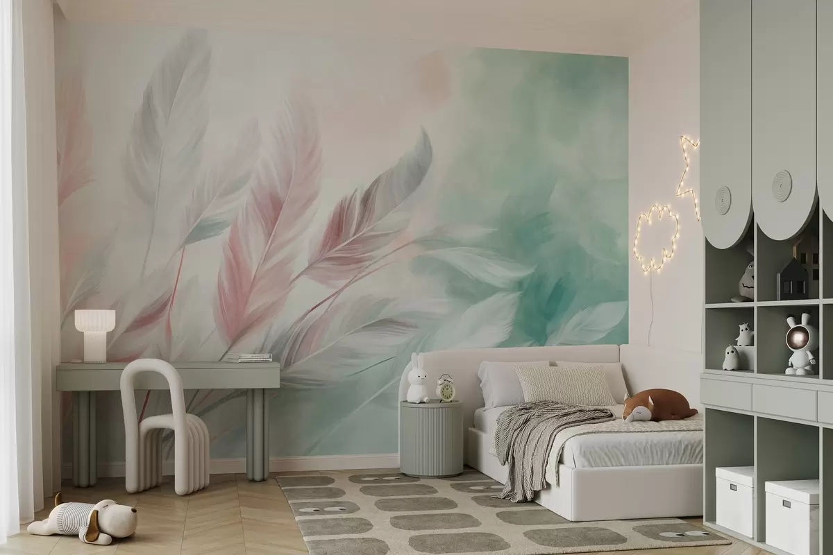Papier peint photo Des plumes aux couleurs pastel texturées, aux bords doux et vaporeux, sur un fond de style aquarelle N° w09833v1