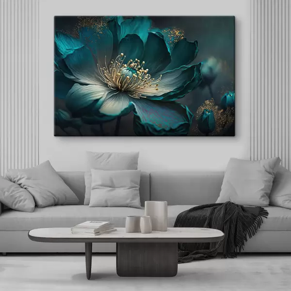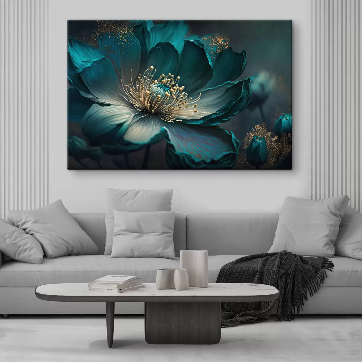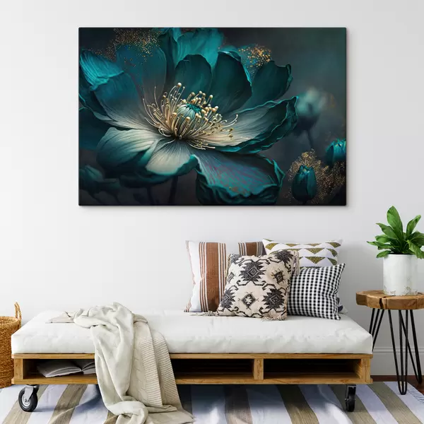 Peinture Gros plan d'un parterre de fleurs turquoise sur fond sombre Art. s34854