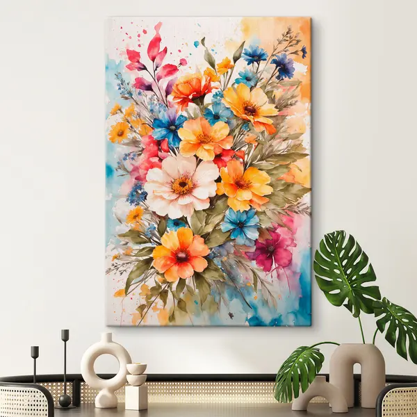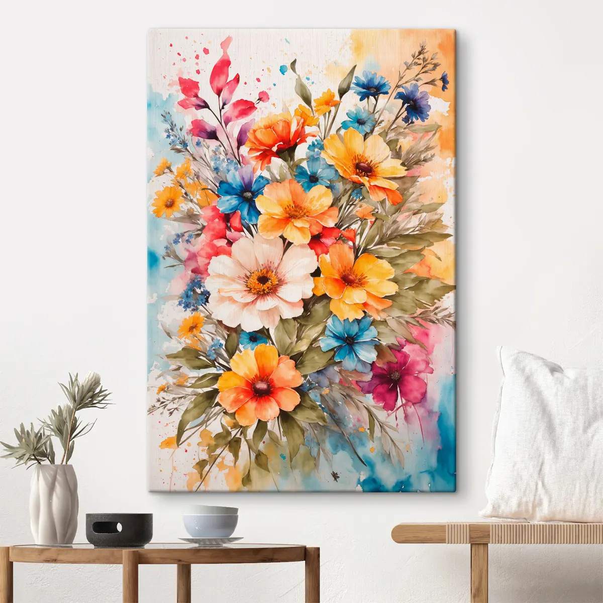 Peintures Bouquet de fleurs roses, jaunes, bleues et rouges à l'aquarelle s36121