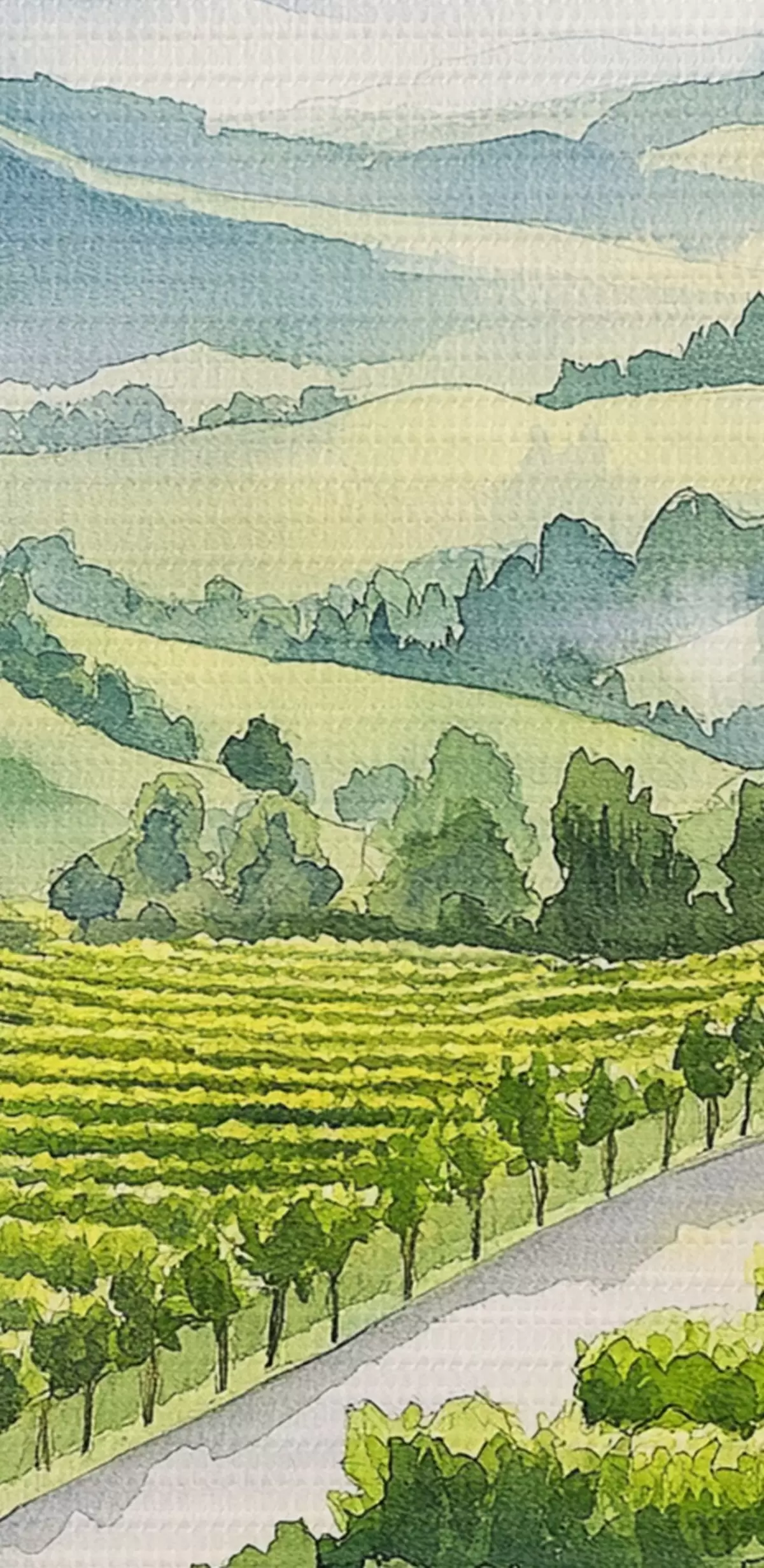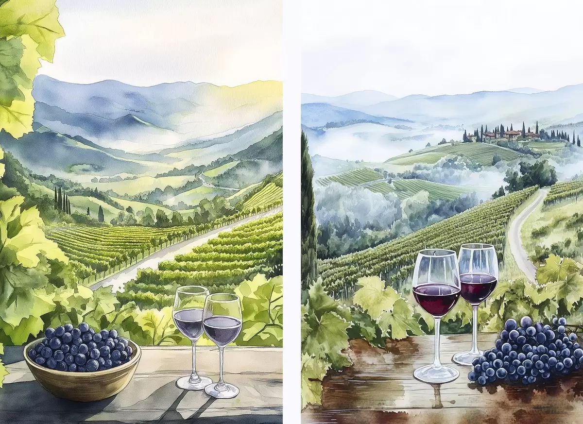 Peinture Beaux paysages de Toscane, vignobles, verres à vin, style aquarelle, Italie Art. m00408