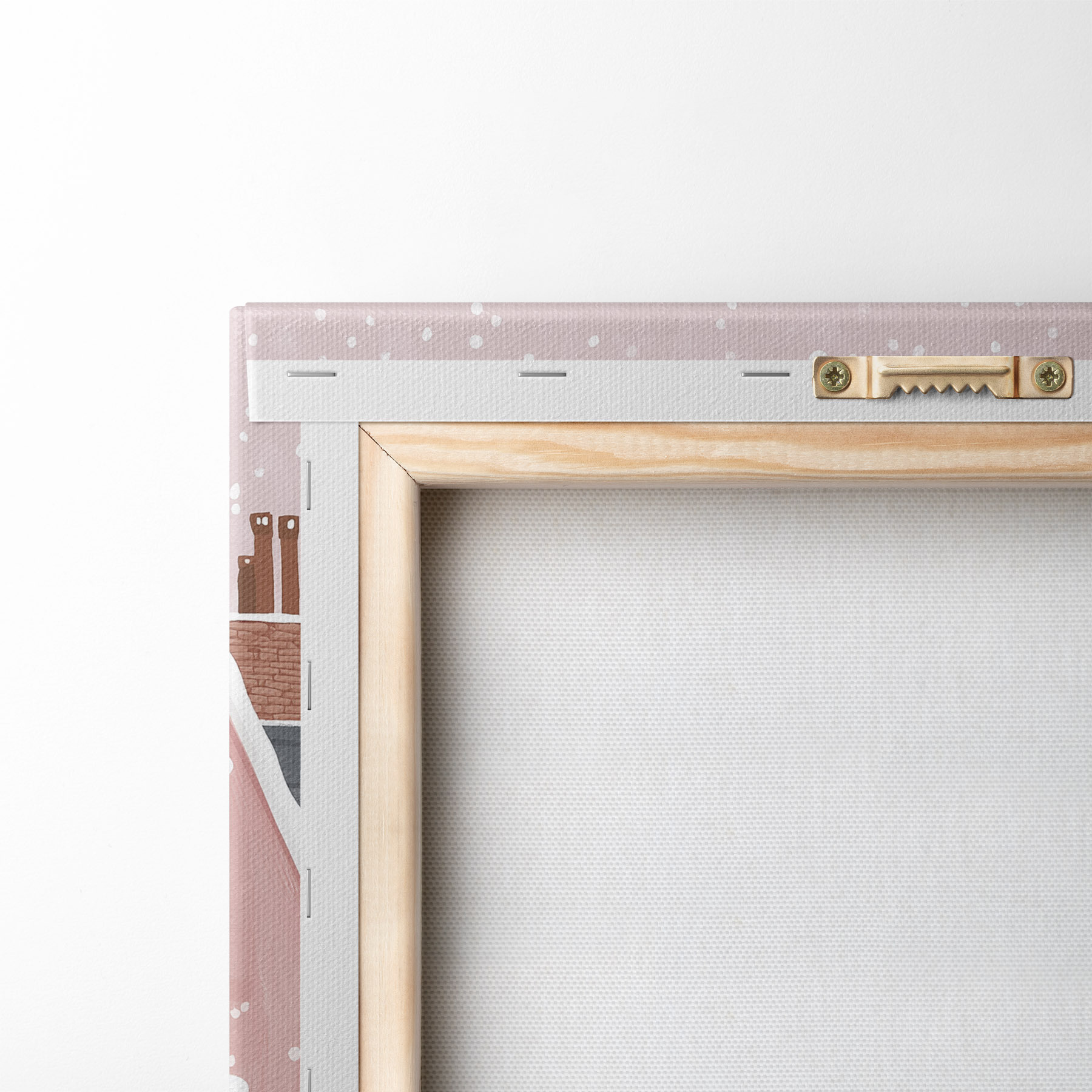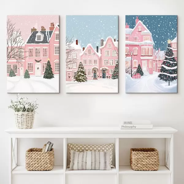 Peinture Belle ville d'hiver avec des maisons roses, des pins et des flocons de neige Art. m00410