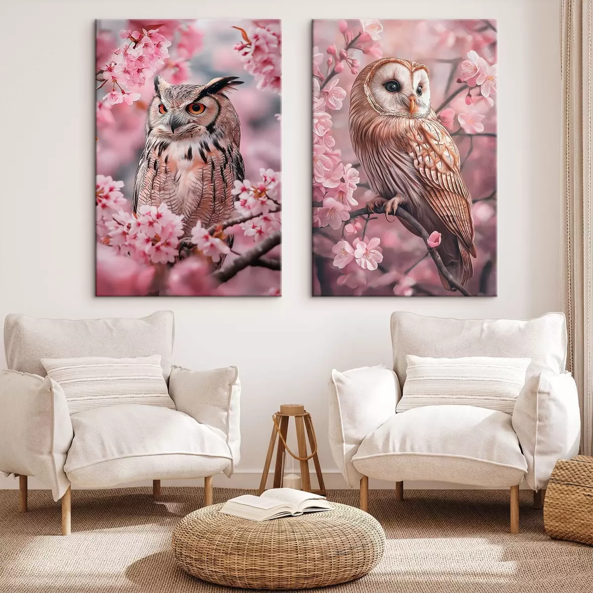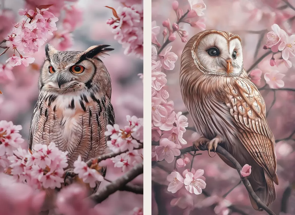 Peinture Hiboux sur le cerisier, fleurs roses, réalisme, nature Art. m00411
