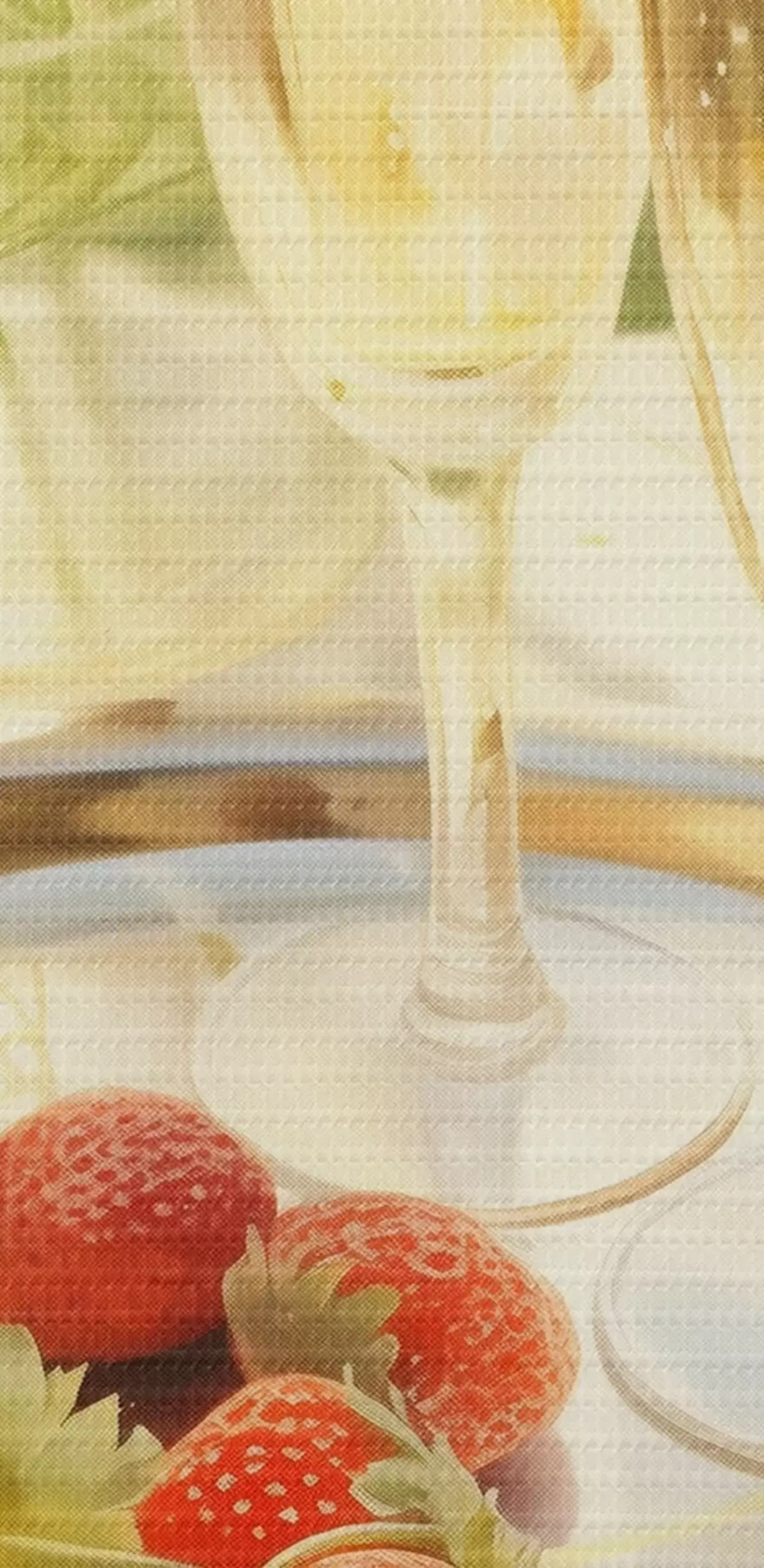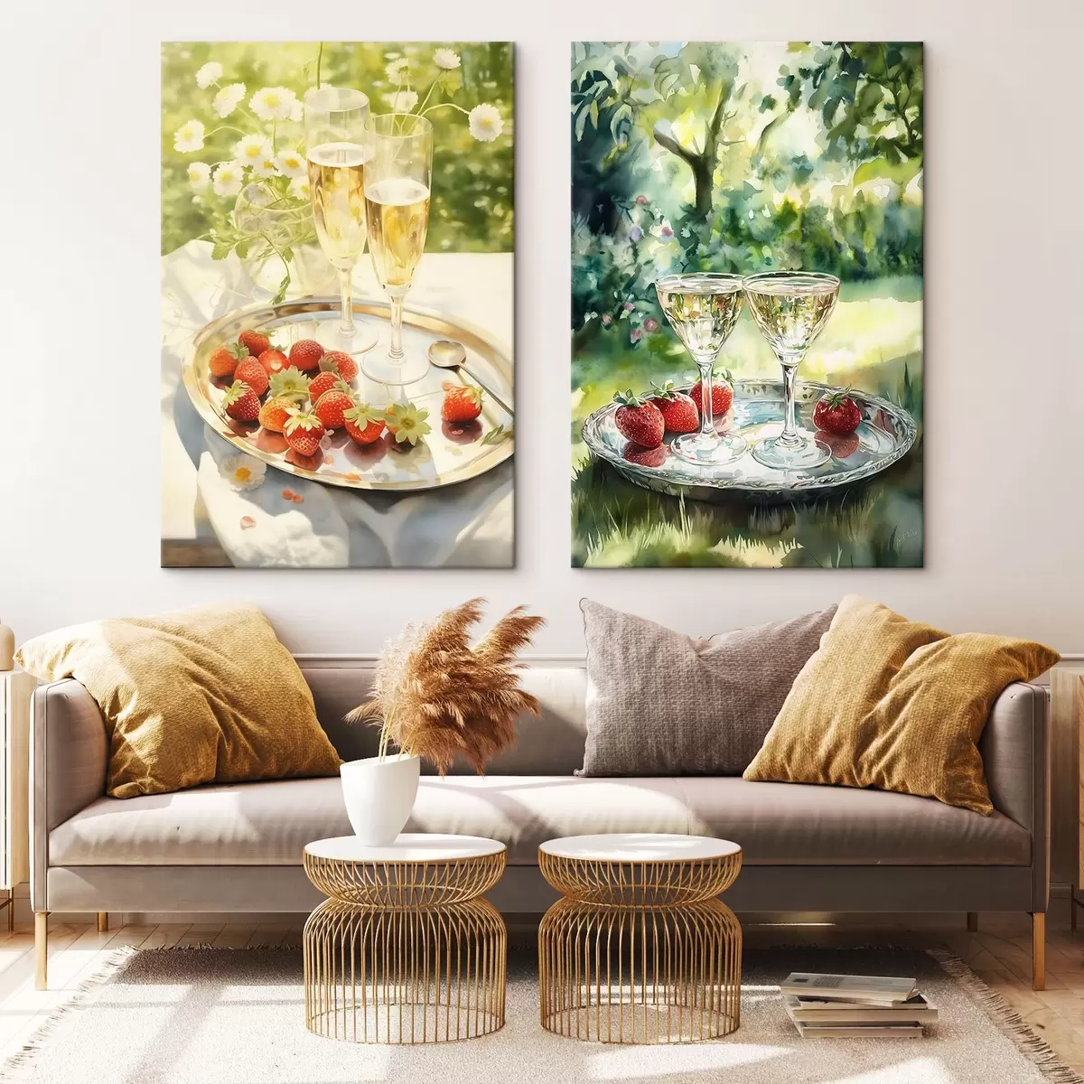 Peinture Pique-nique d'été, coupes de champagne avec fraises sur le plateau, fleurs de camomille Art. m00414
