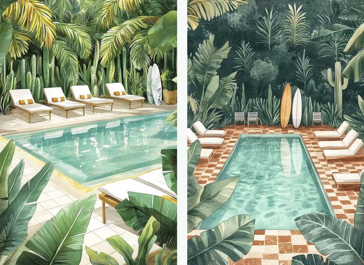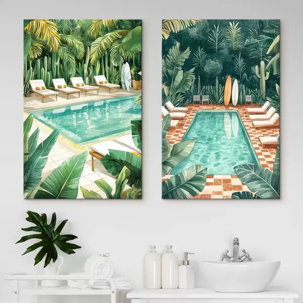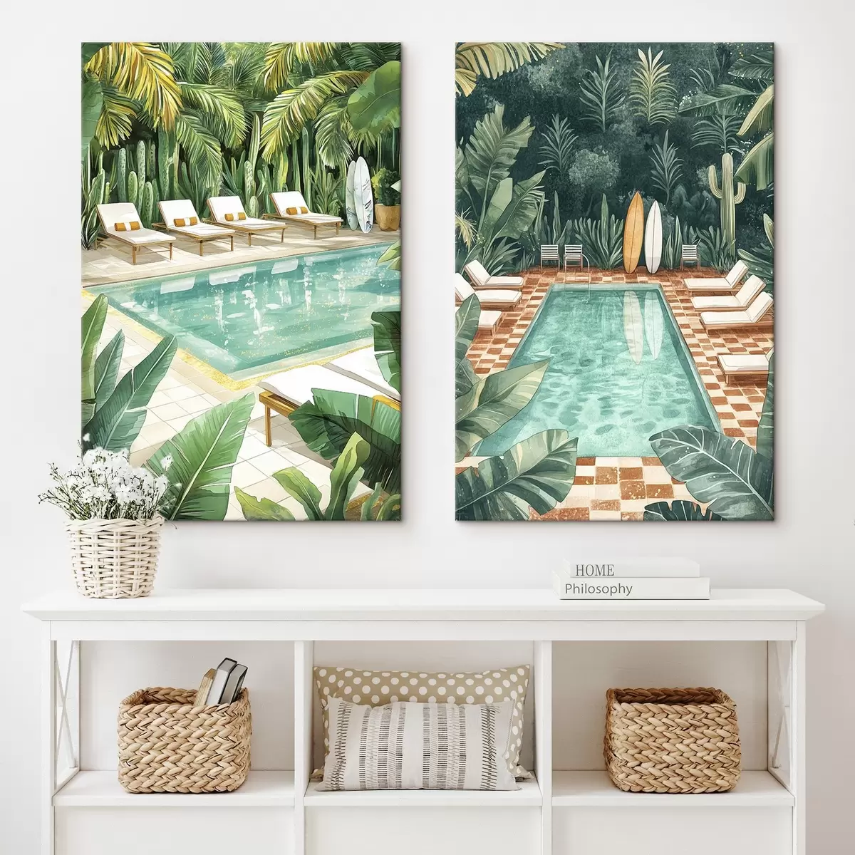 Peintures Piscine d'été, vintage, forêt tropicale, verdure, palmiers, style aquarelle m00422