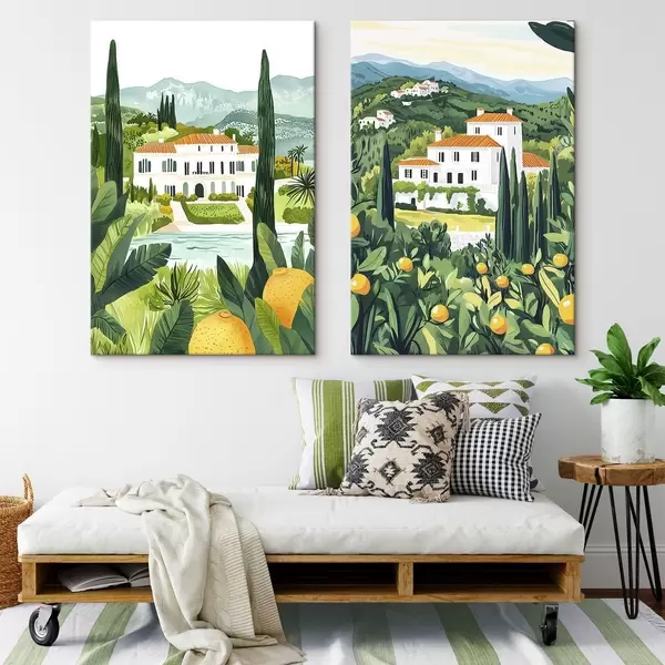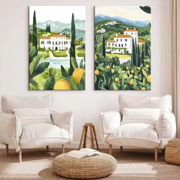 Peinture Paysages méditerranéens avec arbres et maisons, côte maritime, Espagne Art. m00450