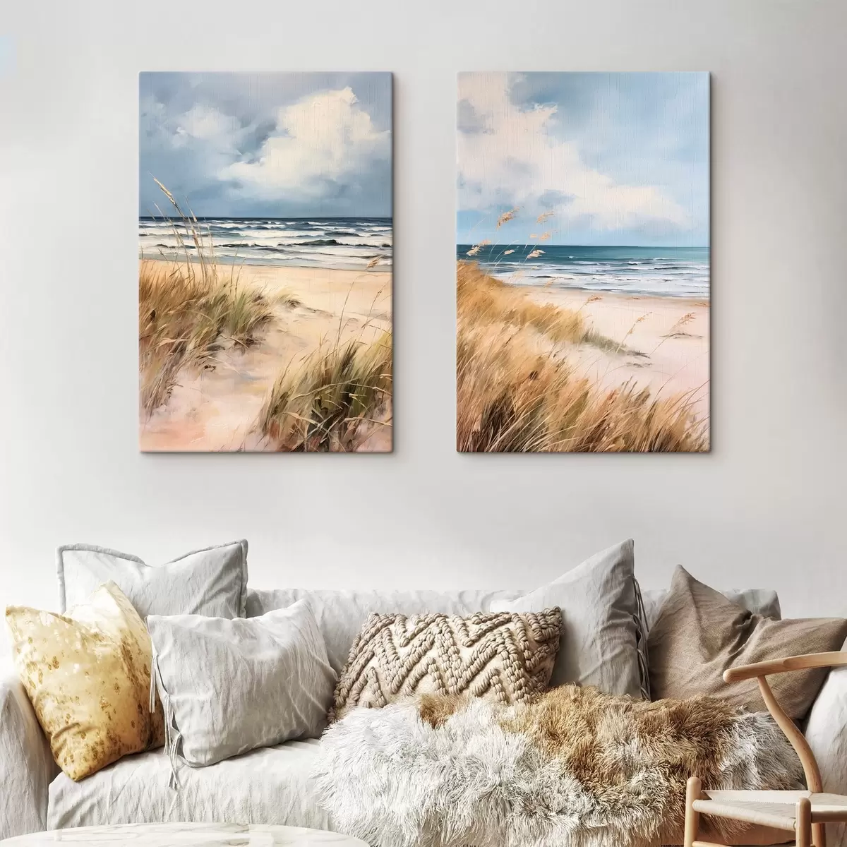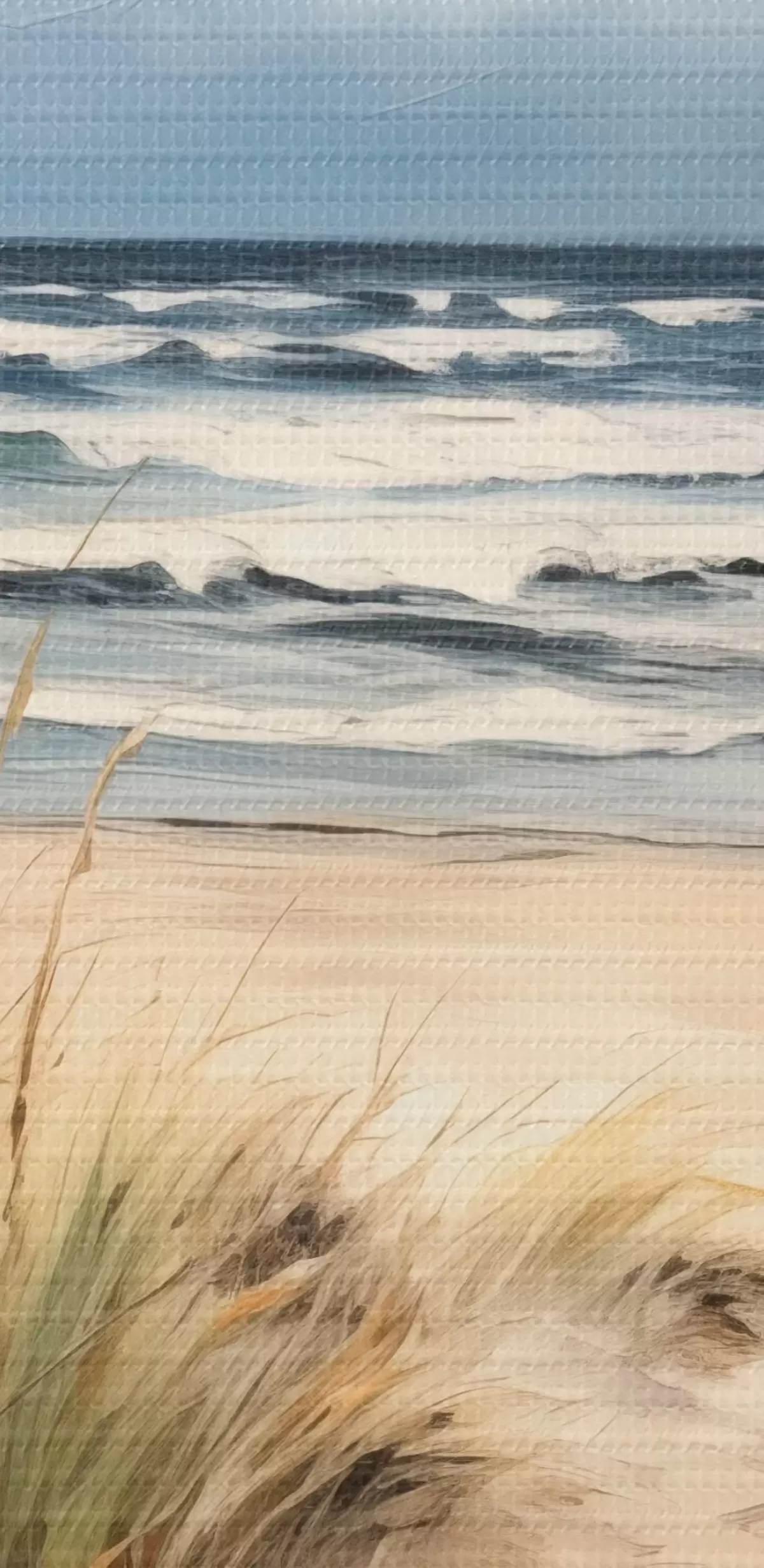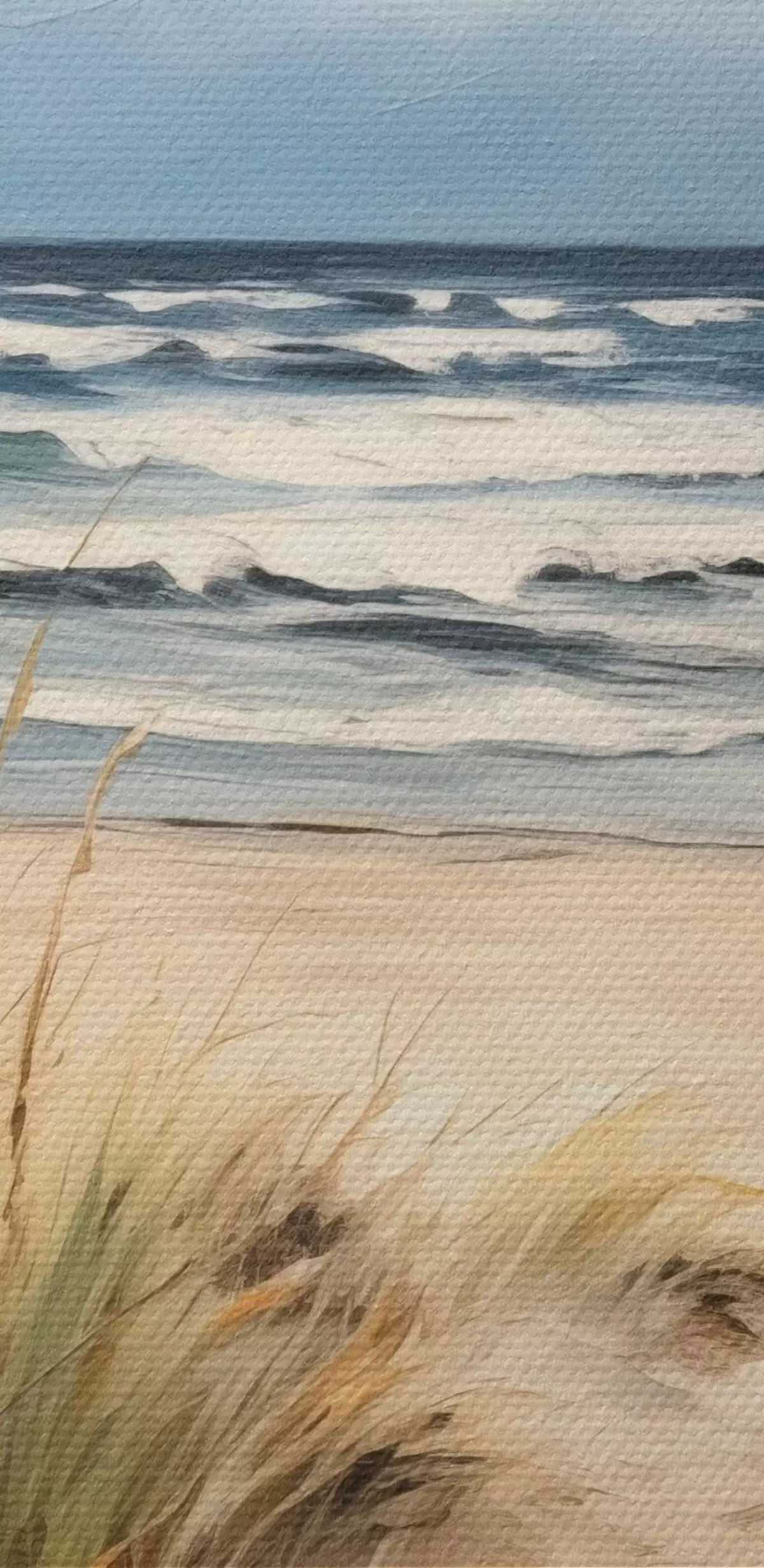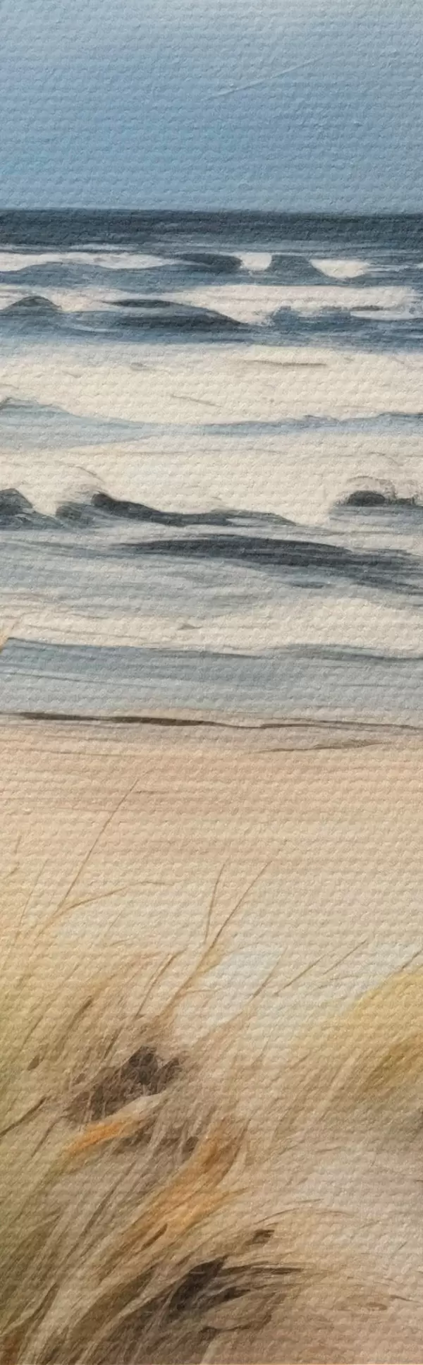 Peinture Une plage de sable avec des herbes hautes au premier plan, l'océan avec des vagues et un ciel nuageux à l'arrière-plan Art. m00521