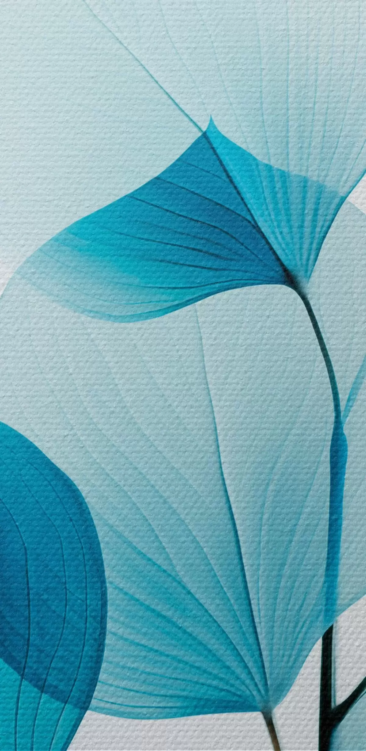 Peintures Branche avec des feuilles bleues translucides, veines délicates visibles, composition légère et calme, esthétique minimaliste m00522