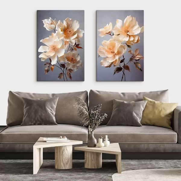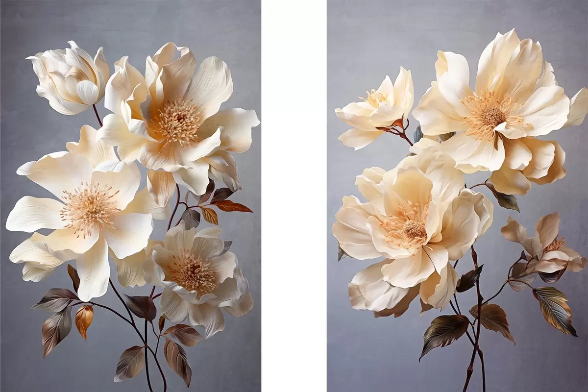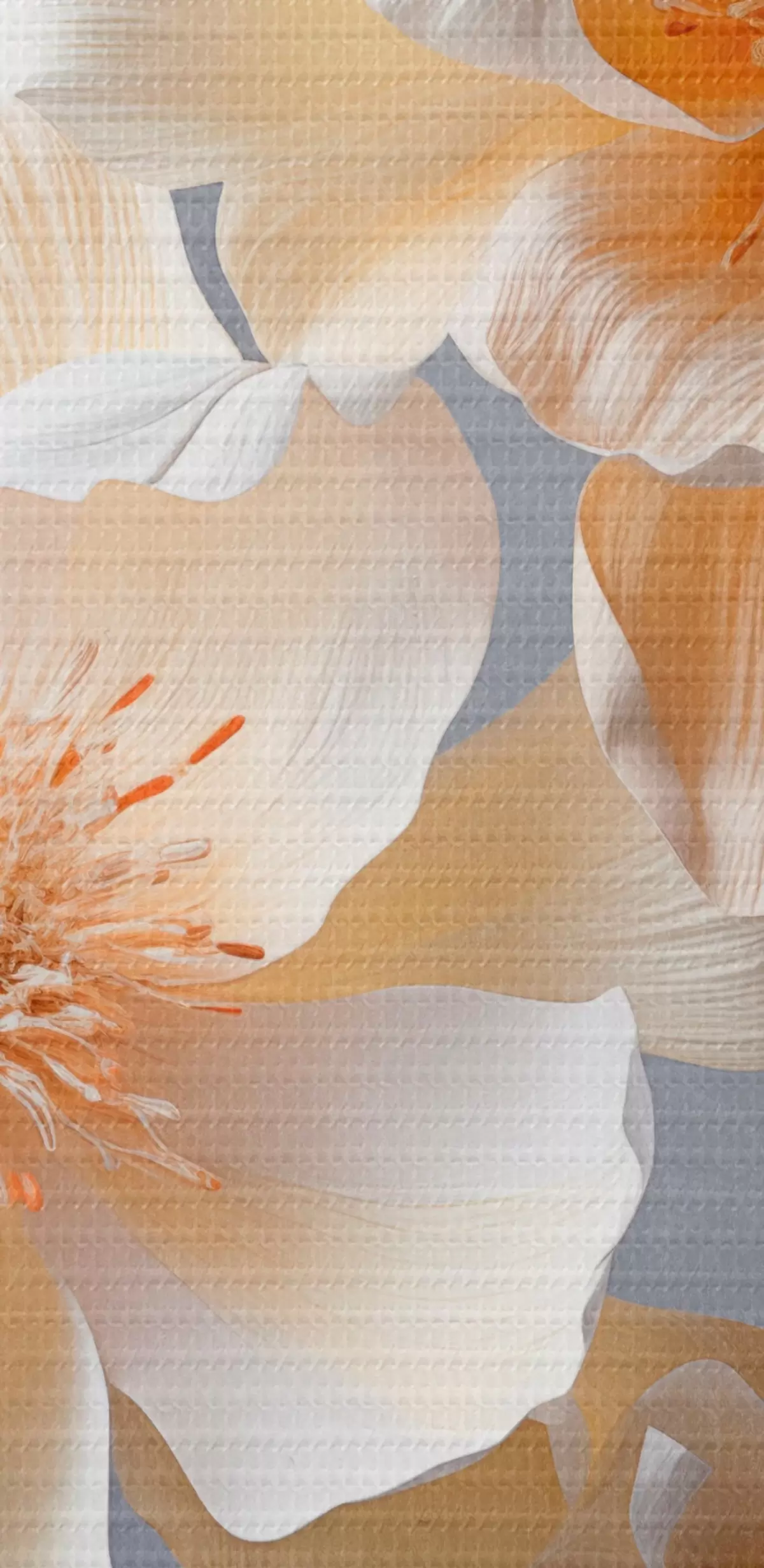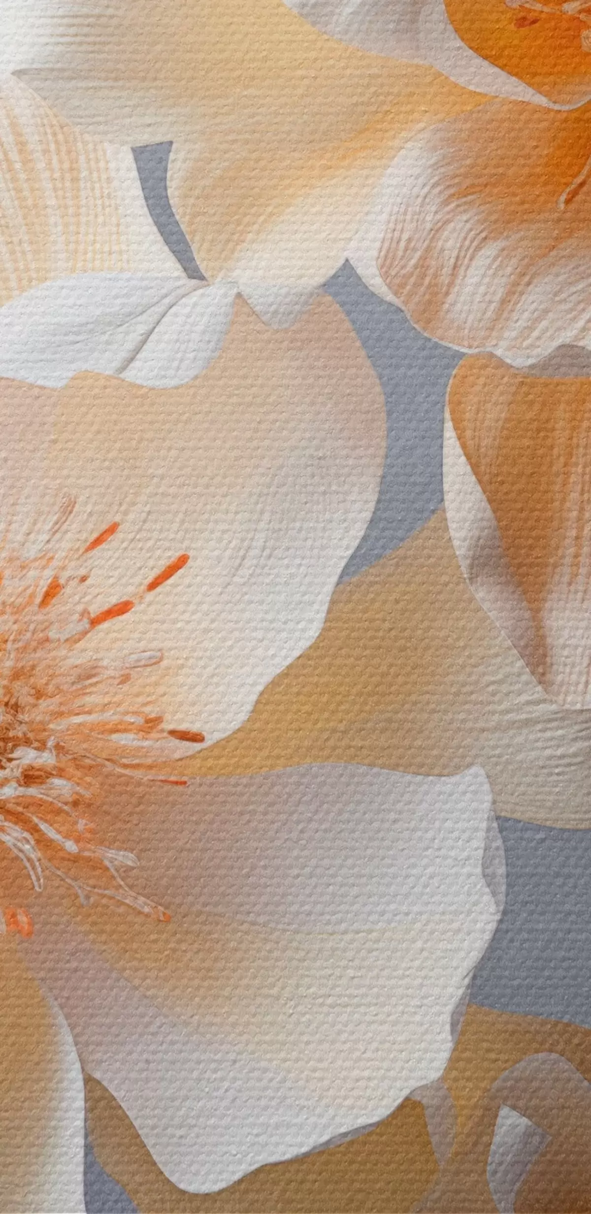 Peinture Fleurs texturées avec pistils orange et feuilles orange sur fond gris, lumière douce, élégant, détaillé, réaliste Art. m00525
