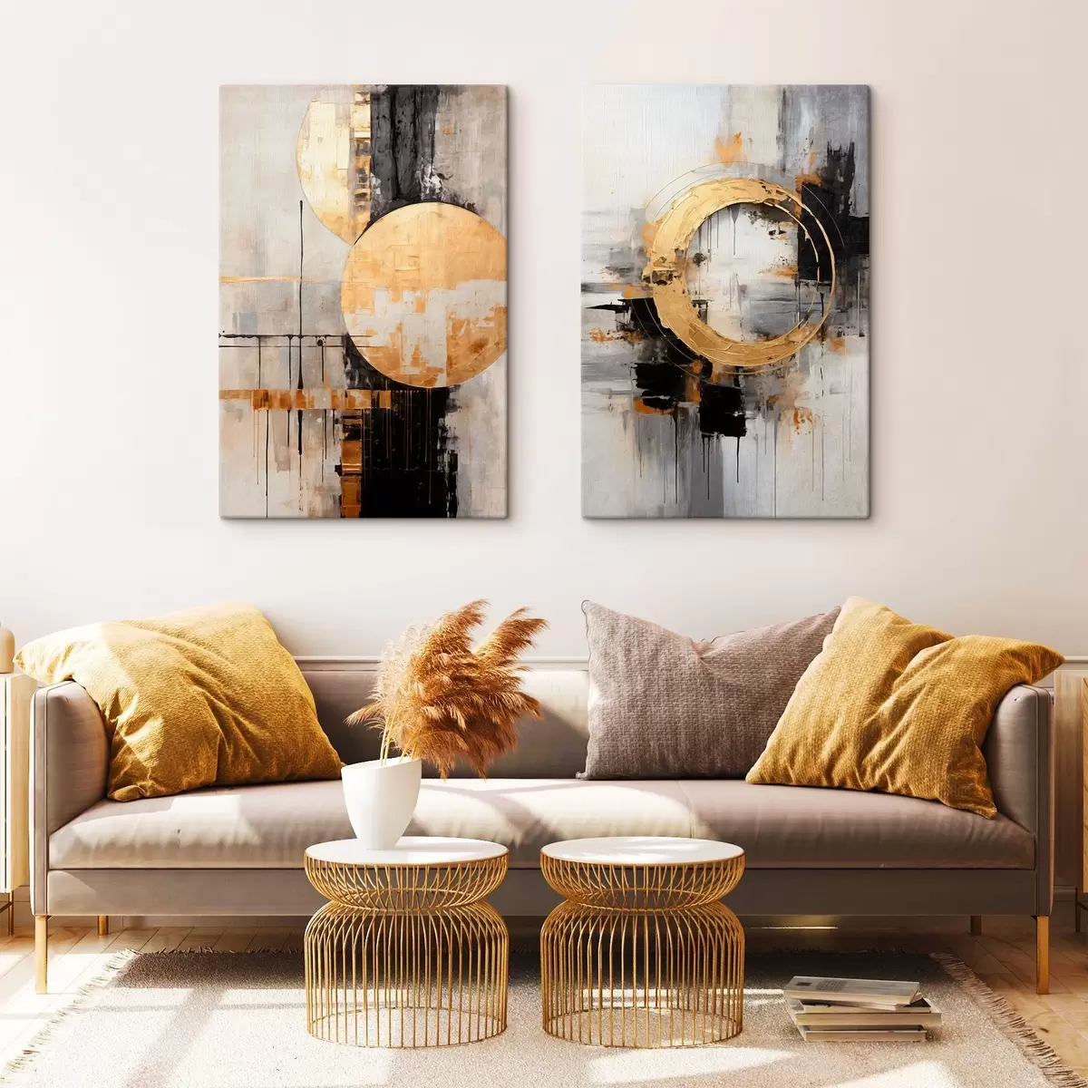Peinture Peinture abstraite avec des cercles, des lignes noires et jaunes, et un arrière-plan dans les tons gris et blancs Art. m00527