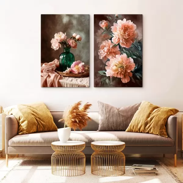 Peintures Composition jumelée avec des pivoines roses dans un vase et sur toile m00578