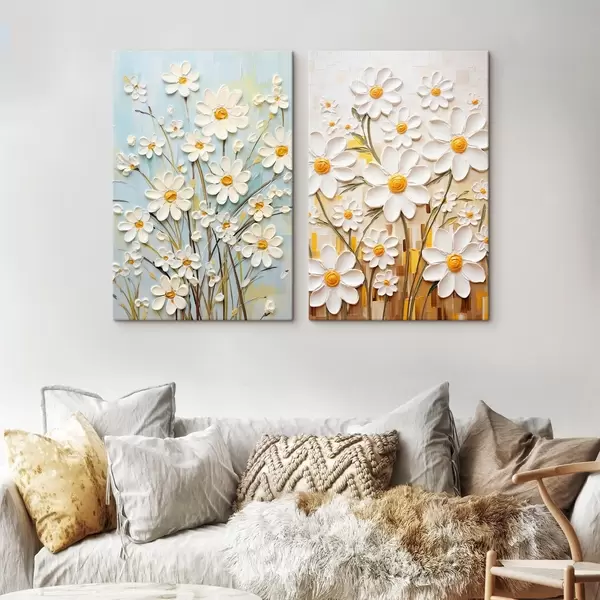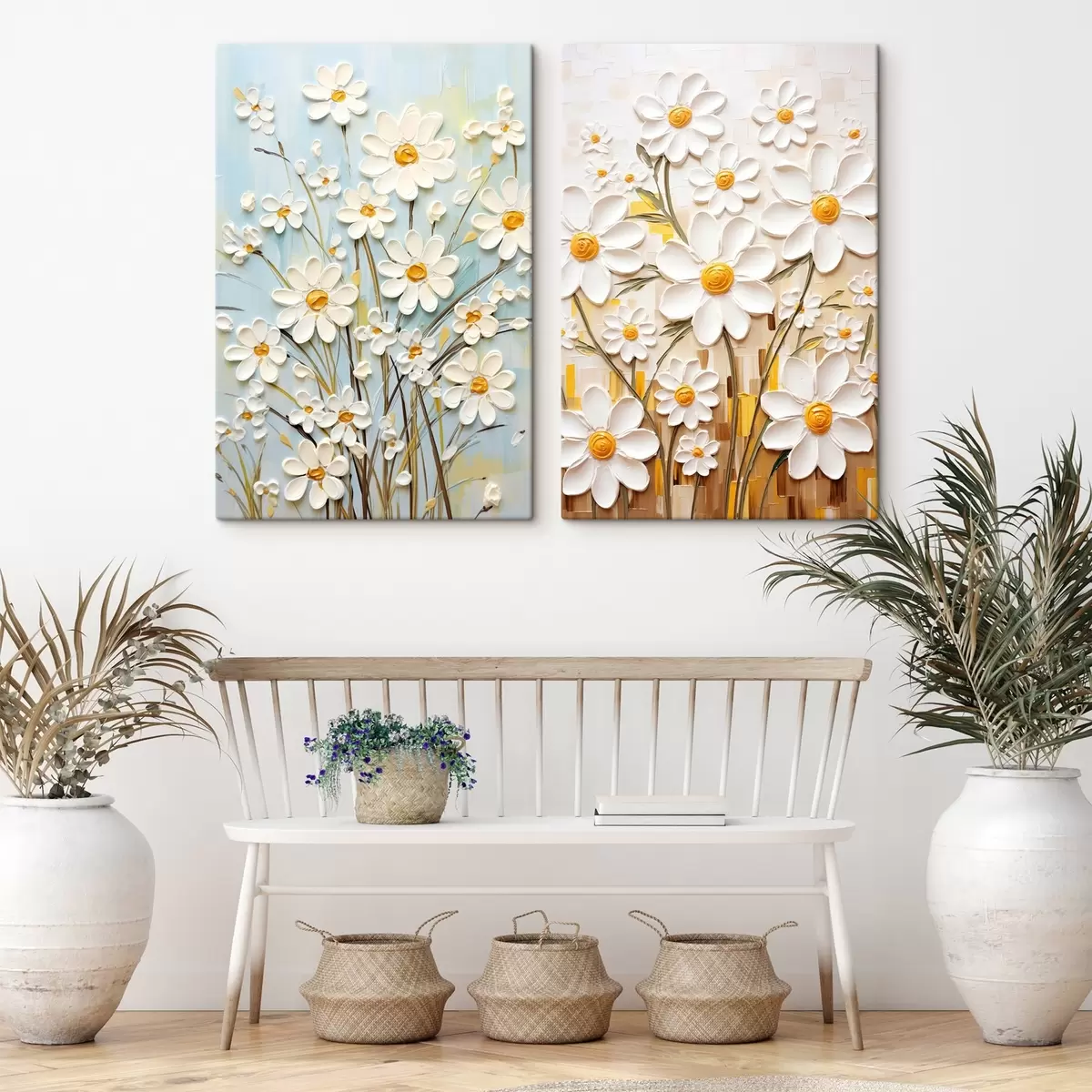 Peintures Fleurs ensoleillées : duo artistique avec des marguerites volumétriques et des accents jaunes m00580
