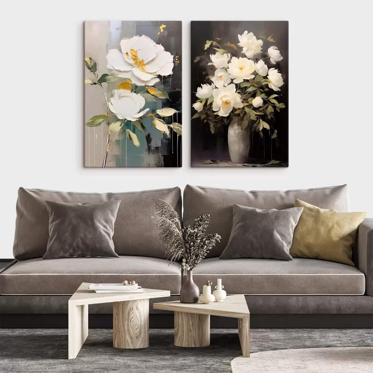 Peintures Pivoines blanches sur fond sombre : composition décorative m00634