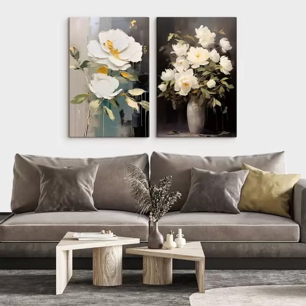 Peinture Pivoines blanches sur fond sombre : composition décorative Art. m00634