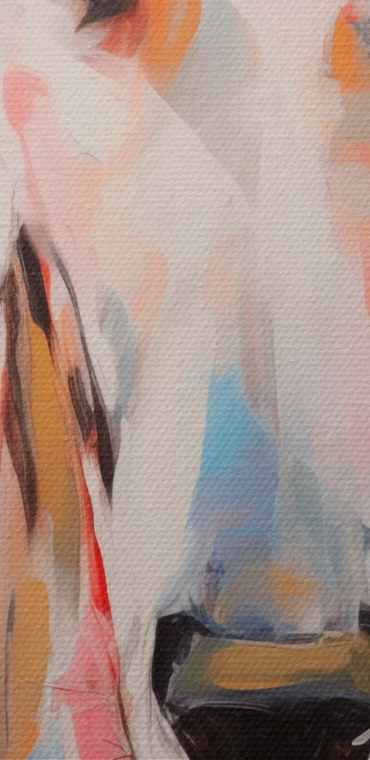 Peinture Un chien lévrier, peint avec des couleurs vives comme l'orange, le rose et le bleu, sur un fond blanc uni Art. m00652