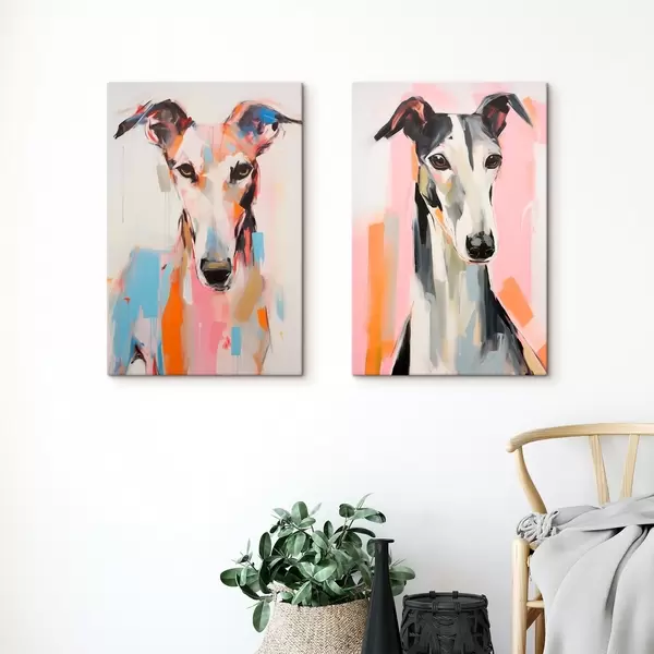 Peinture Un chien lévrier, peint avec des couleurs vives comme l'orange, le rose et le bleu, sur un fond blanc uni Art. m00652