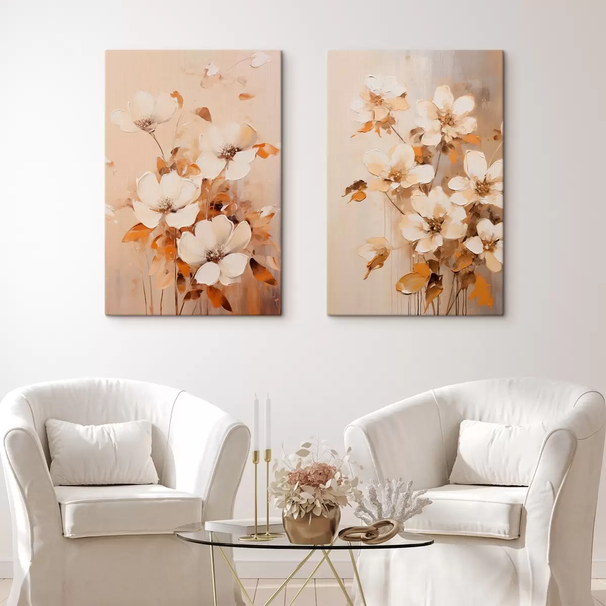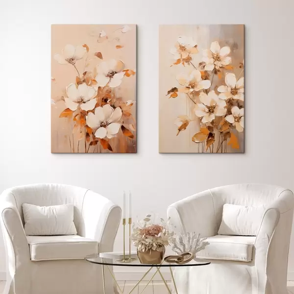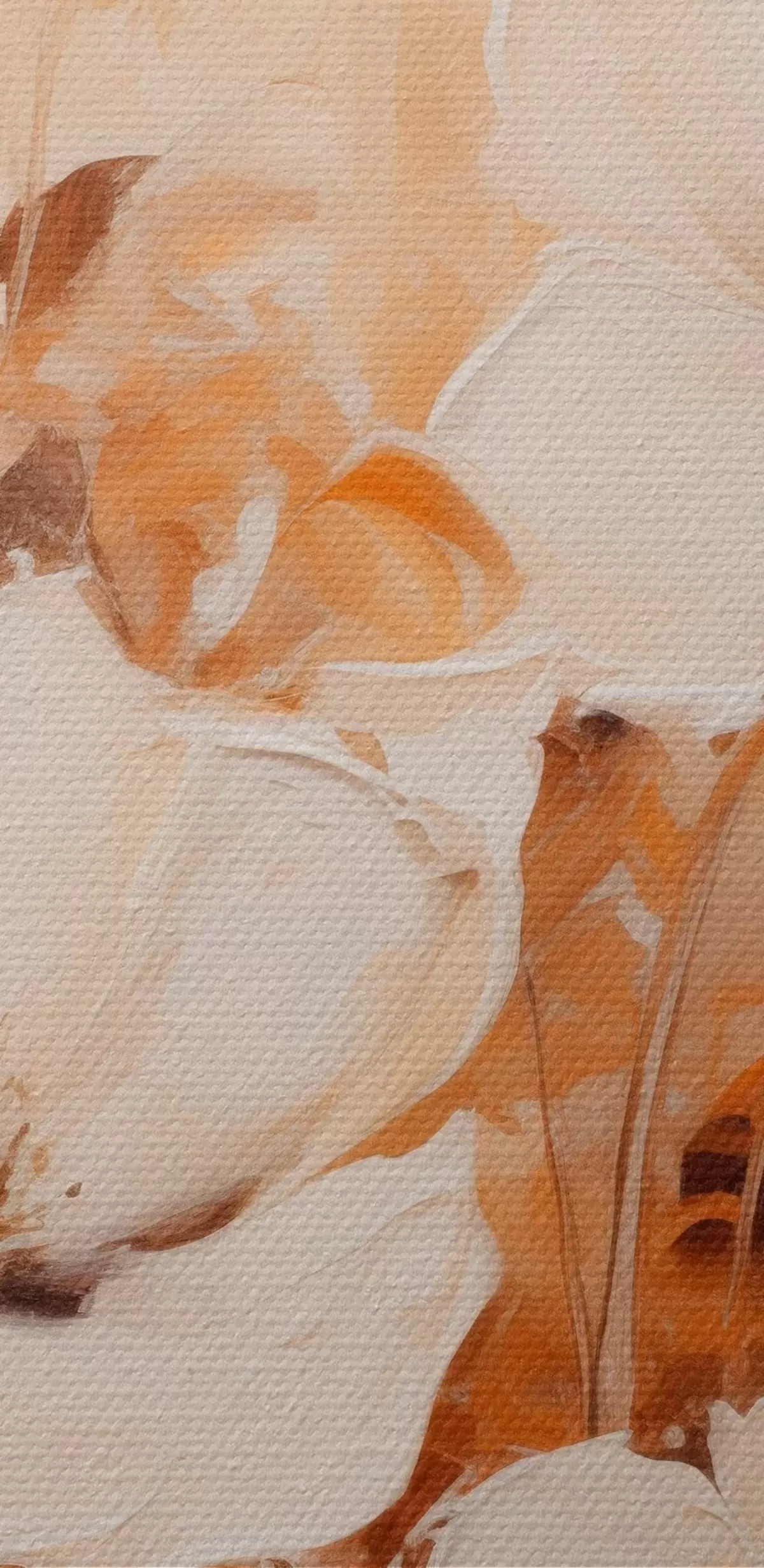 Peinture Fleurs blanches avec feuilles orange, coups de pinceau délicats, palette de couleurs chaudes, composition élégante Art. m00656