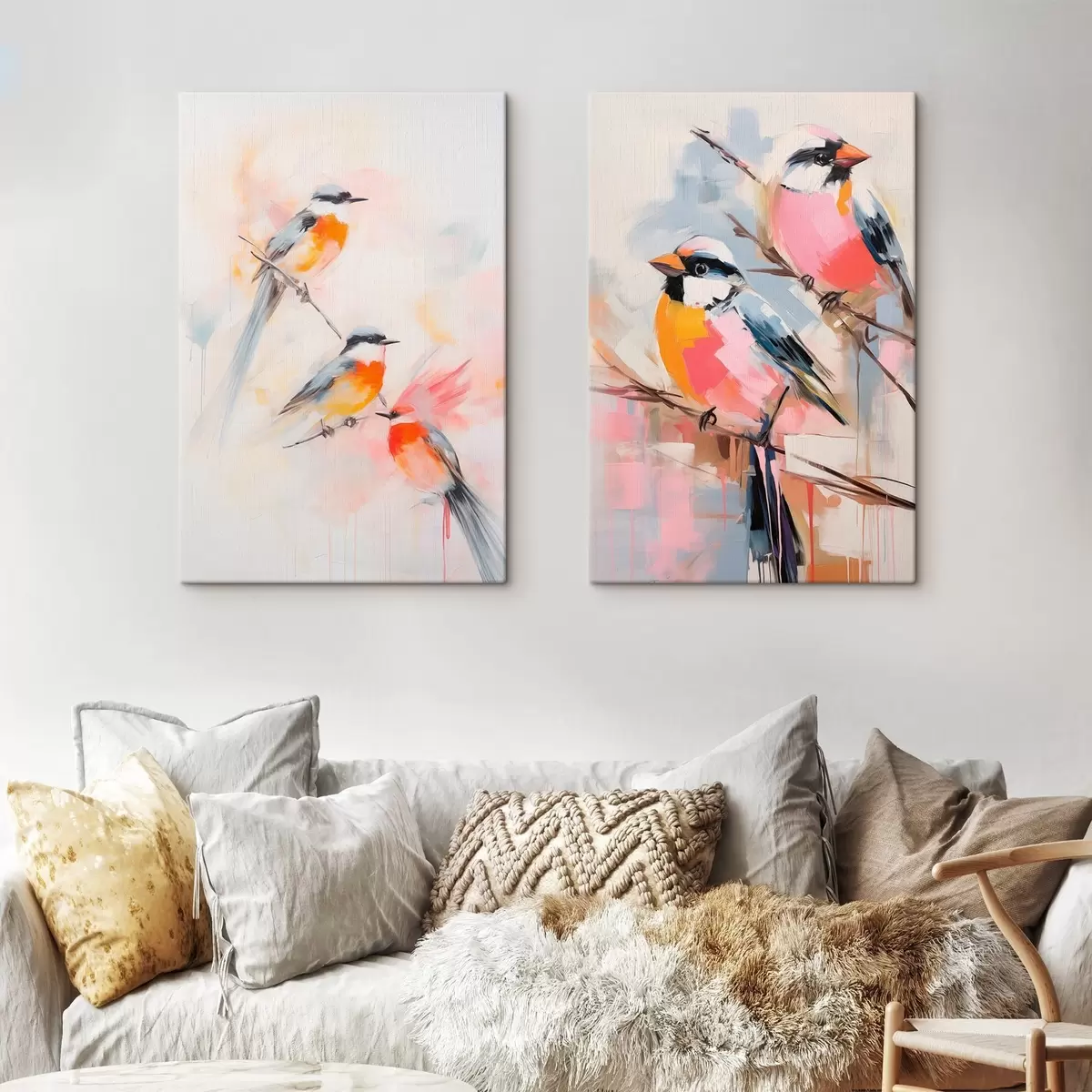 Peintures Oiseaux perchés sur des branches, couleurs douces et pastel, fond clair avec des teintes roses et blanches m00658