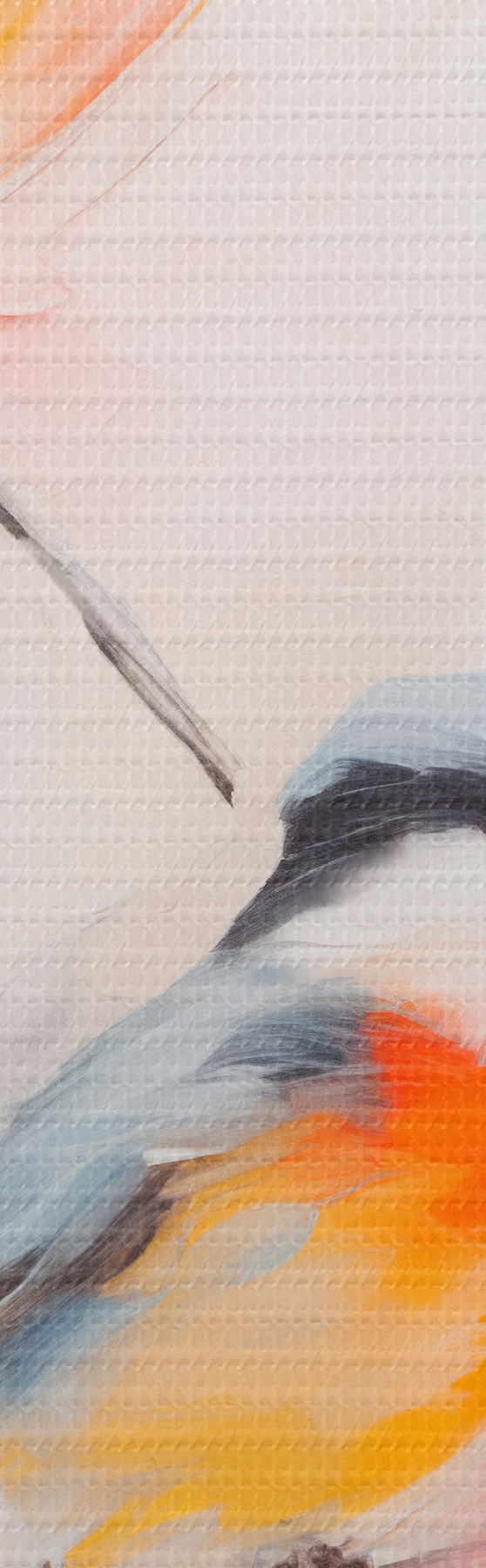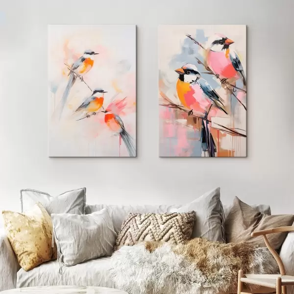 Peinture Oiseaux perchés sur des branches, couleurs douces et pastel, fond clair avec des teintes roses et blanches Art. m00658