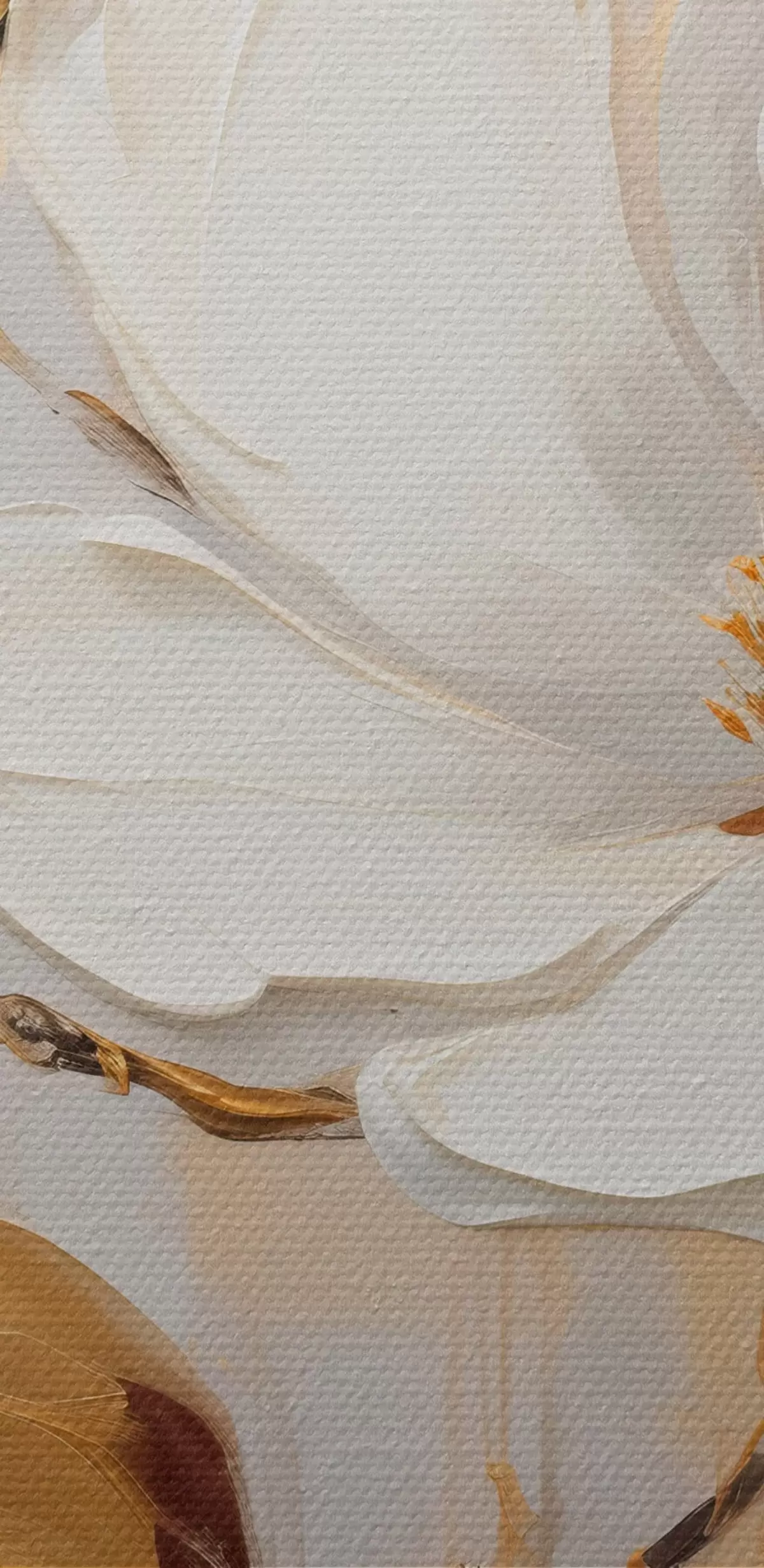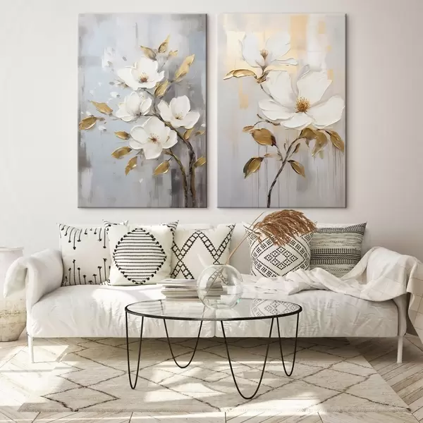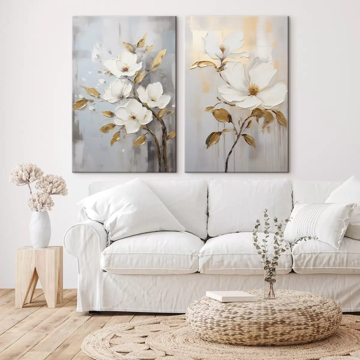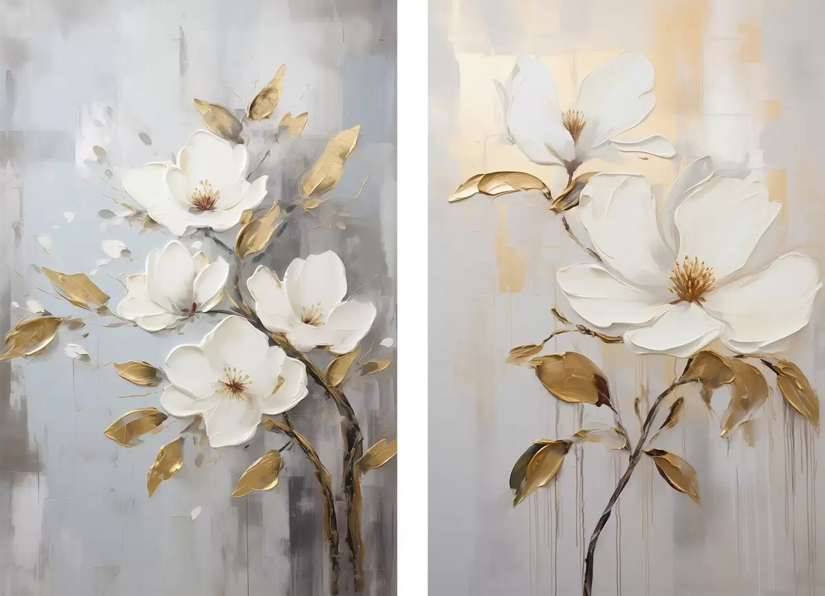 Peinture Deux fleurs blanches avec des feuilles jaune-orange sur un fond clair Art. m00687
