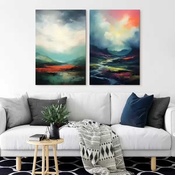 Peintures Paysage abstrait avec nuages dans les tons turquoise et rouge m00691