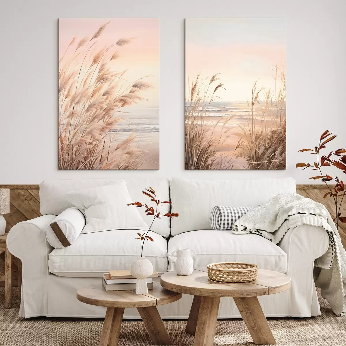 Peintures Herbe de la pampa avec une palette de couleurs orange pastel, un ciel rose pâle, un paysage paisible m00823