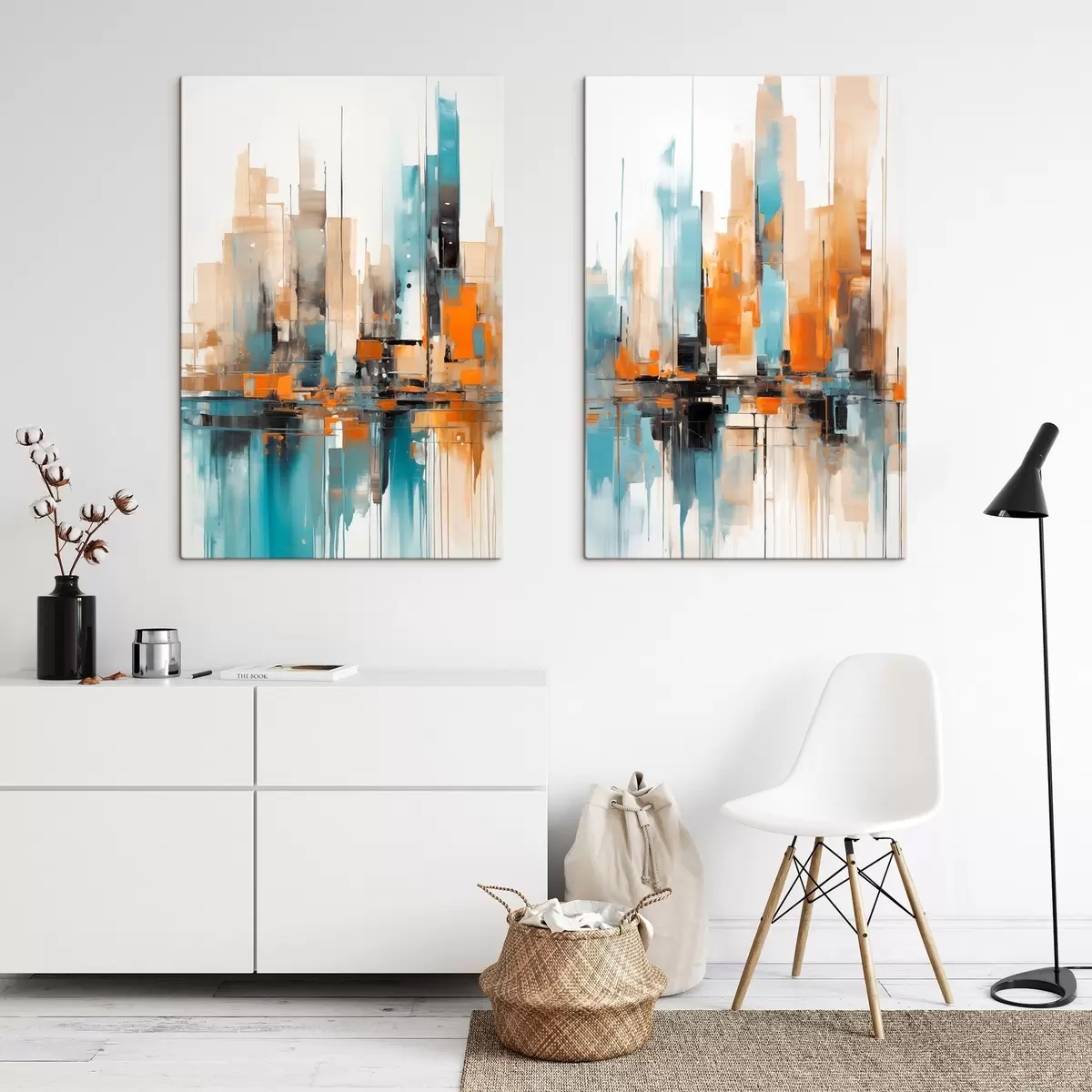 Peintures Paysage urbain abstrait avec des coups de pinceau verticaux dans des tons orange, bleu et blanc, style pictural m00876